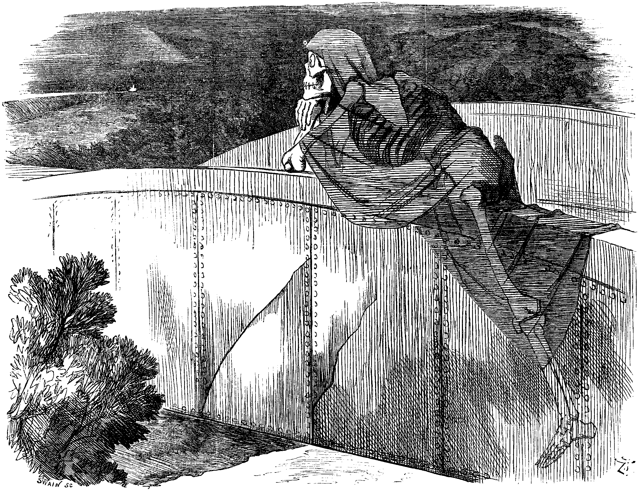 Ascent continued. Leads down-hill. Curious. Sound of dashing waterfall close by. Must see it. Turn round a corner. No waterfall at all, only the Electric-Light-generating station! Noise I heard was the "machinery in motion." Query—does an iron shed with chimney pouring out factory smoke, add to charms of wild scenery?