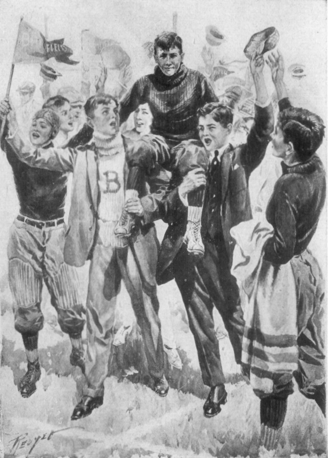 And they were, a score of them, with Amy in the lead, Amy laughing and jubilant and devil-may-care! And Clint, protesting, still a bit faint and pale, but immeasurably happy, was lifted to willing shoulders from where, a little vaguely, he looked down upon a sea of frantically cheering youths who waved maroon-and-grey banners and behaved in the time-honoured custom of the conqueror.