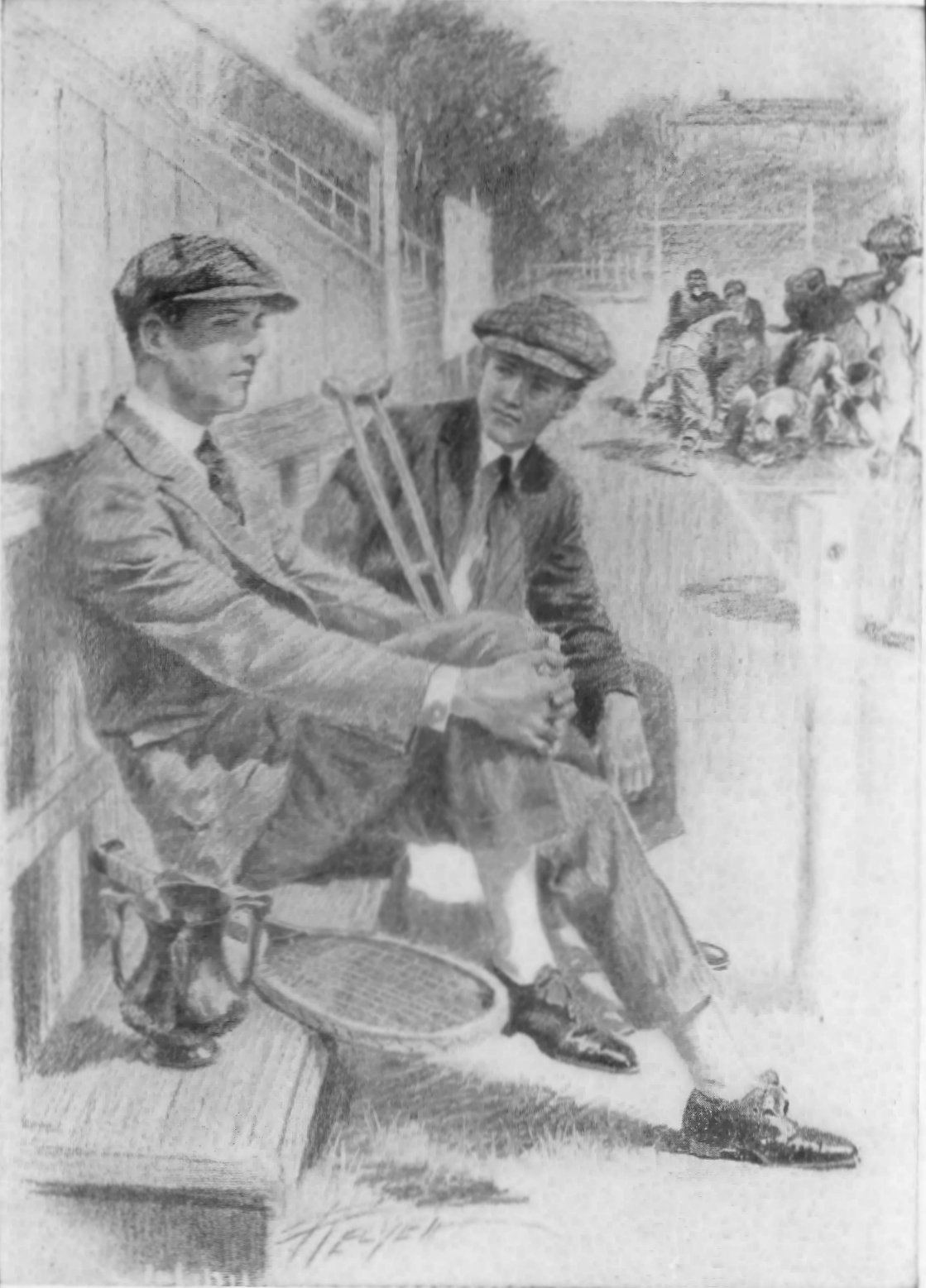 Penny, however, was very elusive, and it was not until a few minutes before the game started that Amy finally located him in the top row of the temporary grand-stand. Even then Amy could only get within shouting distance, but shouting distance sufficed.