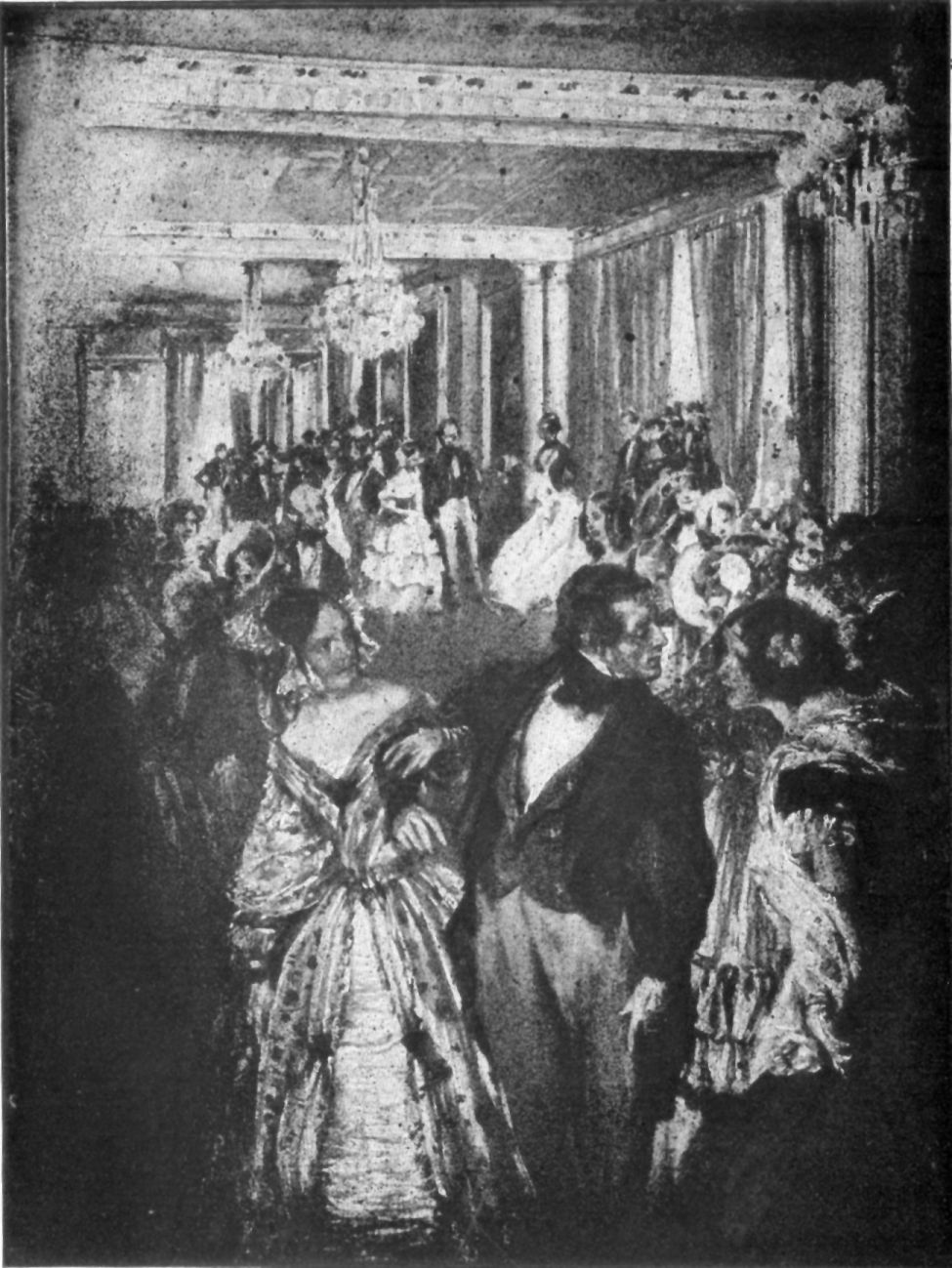Whatever might have been said as to the democratic appearance of our gentlemen in Washington, our women were always our great reliance, and these at least never failed to meet the approval of the most sneering of our foreign visitors. Thus we had present that night, as I remember, two young girls both later to become famous in Washington society; tall and slender young Térèse Chalfant, later to become Mrs. Pugh of Ohio, and to receive at the hands of Denmark's minister, who knelt before her at a later public ball, that jeweled clasp which his wife had bade him present to the most beautiful woman he found in America. Here also was Miss Harriet Williams of Georgetown, later to become the second wife of that Baron Bodisco of Russia who had represented his government with us since the year 1838—a tall, robust, blonde lady she later grew to be. Brown's Hotel, home of many of our statesmen and their ladies, turned out a full complement. Mr. Clay was there, smiling, though I fear none too happy. Mr. Edward Everett, as it chanced, was with us at that time. We had Sam Houston of Texas, who would not, until he appeared upon the floor, relinquish the striped blanket which distinguished him—though a splendid figure of a man he appeared when he paced forth in evening dress, a part of which was a waistcoat embroidered in such fancy as might have delighted the eye of his erstwhile Indian wife had she been there to see it. Here and there, scattered about the floor, there might have been seen many of the public figures of America at that time, men from North and South and East and West, and from many other nations beside our own.