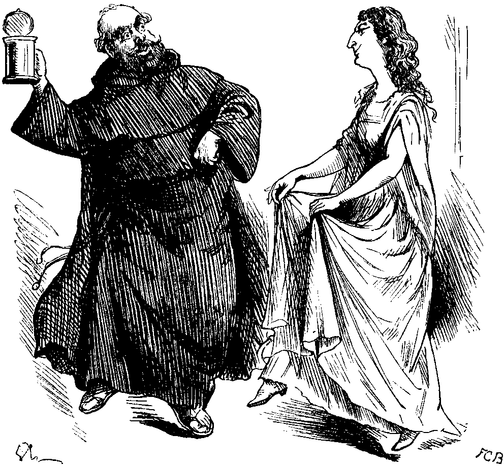 In the Cathedral.—Being shown round by Sacristan, in company with two respectable young Britons. "You shee dot oltarbiece, gentlemens," says Sacristan, "paint by RUBENS, in seexteen day, for seexteen hondert florin." Whereupon both Britons make a kind of "cluck" with their tongues. "Dat vos von hondert florin efery day he vas paint," explains the Sacristan. Britons do this division sum in their heads, check it as correct, and evidently feel increased respect for RUBENS as capable-for an artist—of driving a good bargain. "RUBENS baint him ven he vas seexteen," which younger Briton considers "very creditable to him, too!" They inspect the High Altar, with more clucks, and inform one another, with the air of Protestants who are above prejudice, that it's a marvellous piece o' work, though, mind yer! Sacristan points out holes underneath choir-stalls. "De organ is blay over dere, and de mooshique he com out hier troo de 'oles, so all be beoples vas vender vere de schounds com from!" First Briton remarks to me that "That's a rum start, and no mistake." I agree that it is a rum start. I shall find myself clucking presently, I know! "Haf you scheen yed de bortraits of GLATSHTONE and Lort BAGONSFELDT?" Sacristan asks us "... 'No?' then I show you." He leads us up to the finial of one of the stalls, which is carved in the figure of a monk. "Is not dat de Ole Grandt Man himself?" he asks, triumphantly. Second Briton agrees "It's a wonderful likeness, reelly." His Companion admits "They've got old GLADSTONE there to a t"—but adds that "come to that, it might do for either of 'em." "Lort BAGONSFELDT" is opposite, but, as Sacristan observes, would be more like "if dey only vas gif him a leedle gurl on de vorehead." Next we are taken to the Retro-Choir and shown the "mosh gurious and peautiful bainting in de ole Cathedrale. Schtand yust hier, Gentelmens, now you see him. Beoples say, 'Oh, yais, ve know, yust a marble-garvings—a baw releff!' I dell you, nodings of de kindt. All so flat as a biece of vite baper—com close op. Vat you tink? Vonderful, hey?" Britons deeply impressed by this and other wonders, and inform Sacristan that their own Cathedrals "ain't in it." "Look at the value of the things they've got 'ere, you know," they say to me, clucking, and then depart, after asking Sacristan the nearest way to the Zoo.