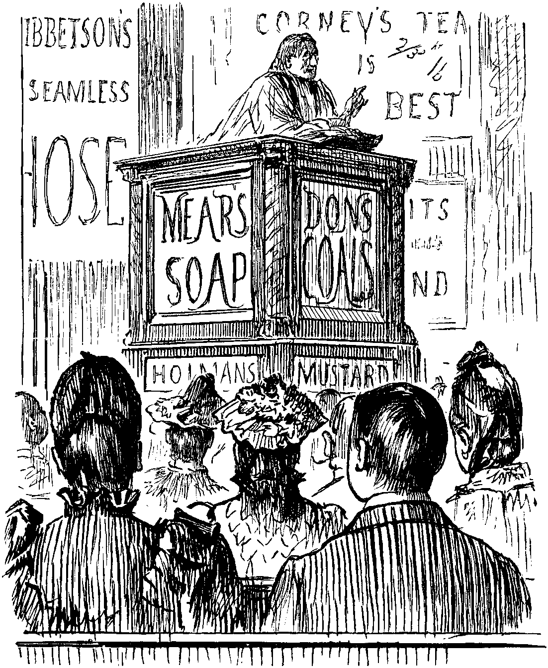Old Fred. Shet up, ole umbereller whiskers! (Screams of laughter from women and children, which encourage him to sing again.) "An' the roof is copper-bottomed, but the chimlies are of gold. In my double-breasted mansion in the Strand!" (To people on platform, as train stops.) Come in, oh, lor, do! "Oi-tiddly-oi-toi! hoi-toi-oy!"