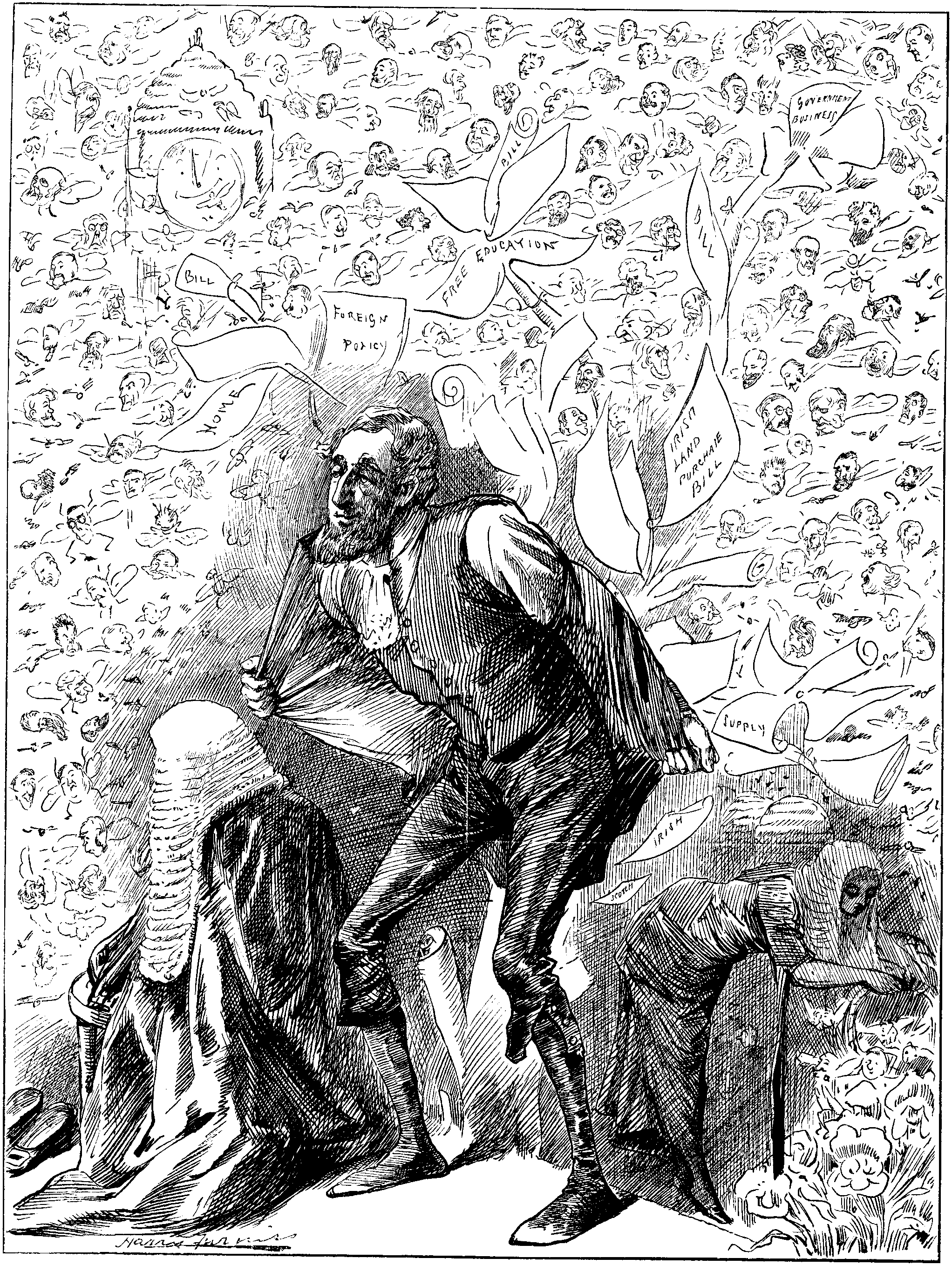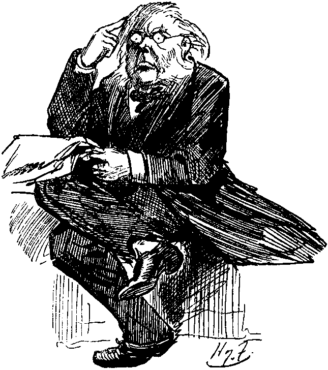 That rather floored ATKINSON; brought him (so to speak) to his senses. Told me afterwards he had never looked on matters in that light. Great advantage having a man like HANKEY going round prepared at moment's notice to take common-sense view of situation and depict it in terse language. Sobering effect on ATKINSON only momentary. Whilst SPEAKER was narrating circumstances on which he had based charge against him of frivolous and vexatious conduct, Member for Boston was bouncing about on seat like parched pea, shouting out, "Oh! oh!" "Ah! ah!" "No you don't!" and offering other pertinent but fragmentary remarks.