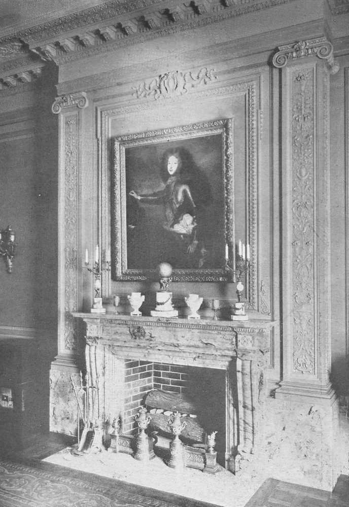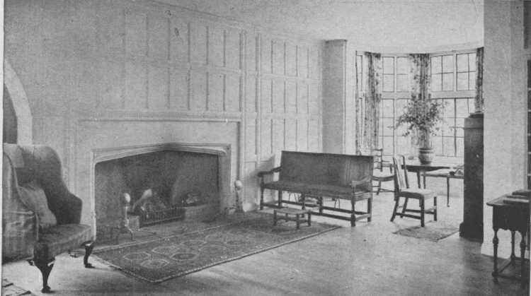 This is in reality a moderate-sized room, yet the open arrangement and the clear center give the impression of great space. The curve of the fireplace and the oak panelling are simple Tudor. The furniture is a mixture of many kinds.