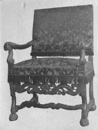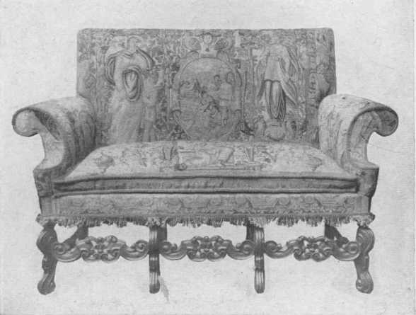 The period of Louis XIV in France was another "magnificent" period and should not be used in small or simple houses. Louis XIV furniture was large and massive, lavish in gilding and carving and ornament, but had dignity as well as splendor. The Gobelin and Beauvais Tapestry Works produced their wonderful series of tapestries, and Boulle inlay of brass and tortoise shell was lavished on furniture, and the ormolu mounts were beautiful and elaborate. All workmanship was of the highest. During the early part of the period the legs of chairs and tables were straight and square in shape, sometimes tapering, and much carved, and had underframing. Later they were curved and carved, a kind of elaborate cabriole leg, and had carved underframing. Toward the end of the period the curved leg and underframing became much simpler, some of the furniture having no underframing, and slowly the style merged into that of the Regency and Louis XV. The illustrations for the long chapter on Louis XIV show some very fine examples of both the grand and simple form of chair, and also show that comfort was becoming more of a fact. The materials used for upholstery were brocades of large pattern, tapestries, and splendid velvets. Tables, chests, armoires, desks, console tables, mirrors, screens, all were carved or painted or inlaid, gilded and mounted with wonderful metal mounts.