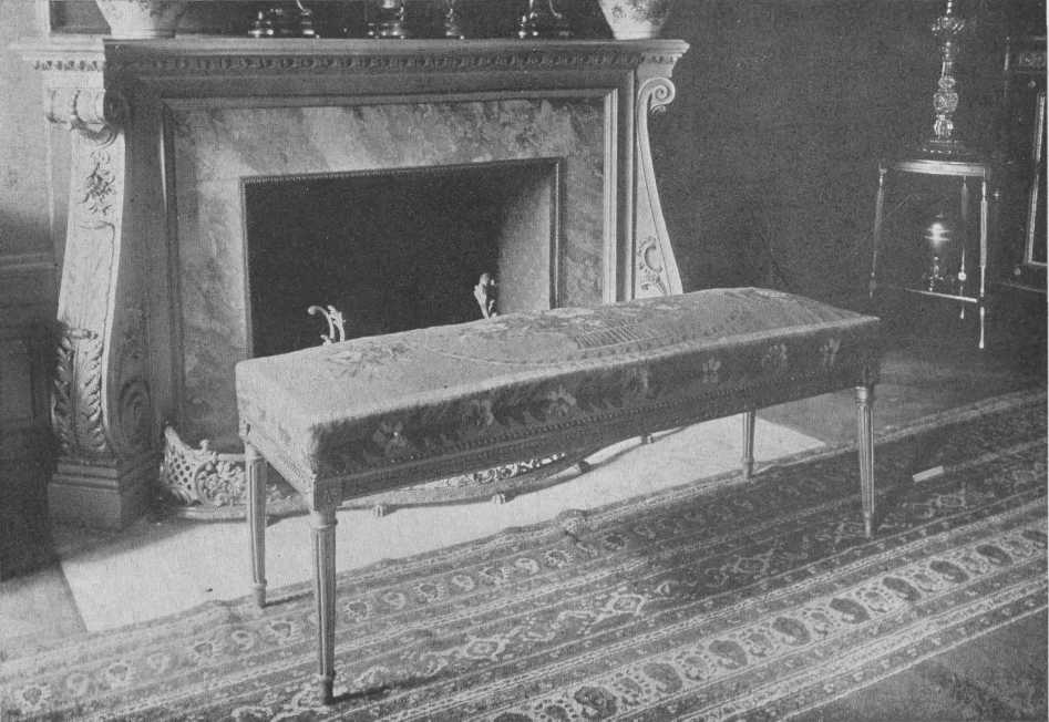The period of Louis XVI was much more beautiful in style than the preceding one, as it was more restrained and exquisite because of the use of the straight line or a gracious, simple curve. This comparative simplicity does not come from lack of true feeling for beauty but rather because of it. The sense of proper proportion was shown in both the furniture and the room decoration. The backs of chairs and settees were round or rectangular, and the legs were square, round, or fluted, and were tapering in all cases. The fluting was sometimes filled with metal husks at top and bottom, leaving a plain stretch between. Walnut and mahogany were much used and were beautifully polished, but had no vulgar and hard varnished glare. There was wonderful inlay and veneer, and much of the furniture was enamelled in soft colors and picked out with gold or some harmonizing color. Gilding was also used for the entire frame. The metal mounts were very fine. Brocades of lovely color and designs of flowers, bowknots, wreaths, festoons, lace, feathers, etc.; chintz, the lovely "toil de Jouy," which is so well copied nowadays; soft toned taffeta, Gobelin and Beauvais and Aubusson tapestries, were all used for hanging and furniture coverings. Cane also became much more popular. Walls were paneled with moldings, and fluted pilasters divided too large spaces into good proportions. Tapestry and paintings were paneled on the walls, and the colors chosen for the backgrounds were light and soft.