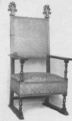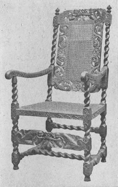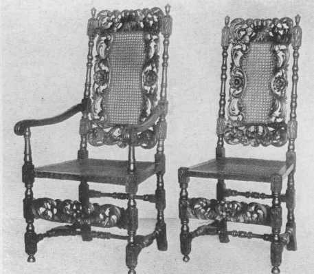 When Charles II came to the throne, there was a reaction against Puritan gloom which showed in the furniture being of a more elaborate design. Chair backs were high and narrow with carved and pierced panels of wood, or carved backs with cane panels, and the carved front rail carried out the feeling and balanced the carved top rail. The crown and rose and shell were used, supported by cherubs and opposed S curves. The illustration opposite page 65 will give a very good idea of the general style. Upholstery was also used, and day-beds and high-boys made their appearance. The chests of earlier days became chests of drawers. Rooms were paneled in oak, and much beautiful tapestry was used. Walnut began to take the place of oak in the later days of Charles II and those of James II, and introduced the age of walnut which lasted through the reigns of William and Mary and Queen Anne.