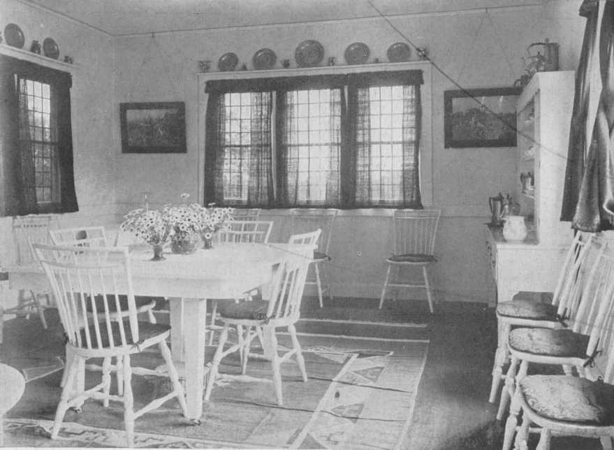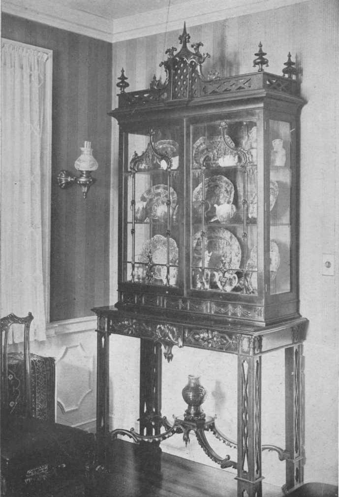 A built-in corner cupboard has an architecturally decorative value for it supplies a spot of color in the paneled walls. The modern china closet is bad, and the chairs have the failing of many reproductions, the backs are a little too high for the width.
