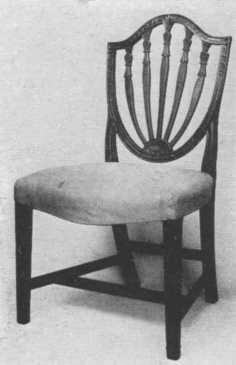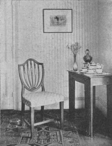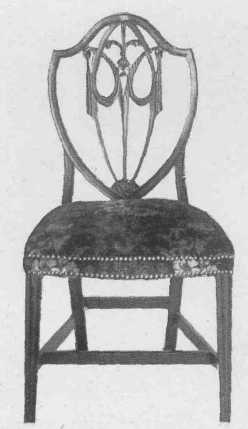 Hepplewhite's furniture has much of the delicacy of Adam's work, by whom, without doubt, he was influenced, as he was also by the French styles of the time. Luckily his own personality and sense of beauty and ingenuity were strong enough to develop a marked and beautiful style of his own. His favorite chair back was shield-shaped (see page 83), and he also used heart-shaped and wheel backs, either round or oval, and charmingly painted little panels. The three feathers of the Prince of Wales was a favorite design. He also made ladder-back chairs, usually with four rails. On much of his furniture the legs tapered on the inside edge only and were put in at a slight angle which gave security both in fact and appearance. He also used reeded legs. His console and other tables are beautiful in design and workmanship, being painted usually in different forms of the radiating fan design, or inlaid with beautiful colored woods. The inlay used was often oval in shape, sometimes only a line and sometimes panels of different woods or matched veneer. The handles used were round or oval. He made sofas and settees with either chair-back backs or all upholstered with the frame showing and the covering tacked on with brass tacks close together. His cabinets are fascinating, with their beautiful inlay and delicate strap work over the glass. He made four-post beds with fluted posts, and chests of drawers and little work tables and candle-stands and screens; and one thing we must be deeply grateful to him for is that he developed the sideboard into a really useful and beautiful piece of furniture. He made nearly everything in the way of necessities, and all show the marks of his taste. His dining-tables were on the plan of those of Chippendale but lighter in effect with tapering legs instead of the long cabriole leg ending in claw feet. His mirrors were usually oval with charming festoons. His favorite woods were mahogany and satin-wood, and he used many fine woods for inlay. Chintz and taffeta and fine velvet are all appropriate to use.