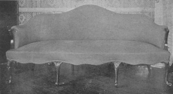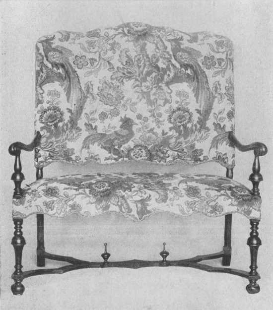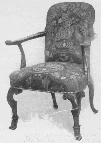 The cup-and-ball design of turned legs with curved stretchers was used for chairs, settees, tables, cabinets. China cupboards with their double-hooded tops and soft colored brocade linings were used to display the wonderful china collections so much in vogue. There was much upholstered furniture covered with beautiful petit-point, which is perfectly reproduced nowadays, but is naturally expensive. Silks, velvets, and damasks were also used, and Queen Mary had a "beautiful chintz bed."