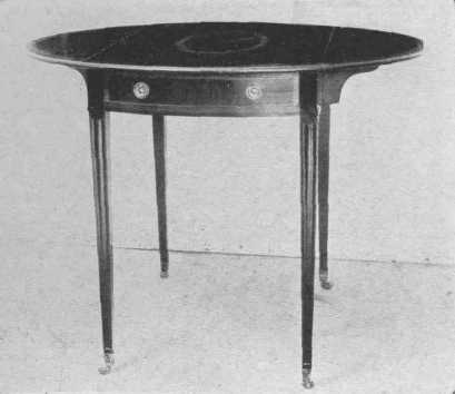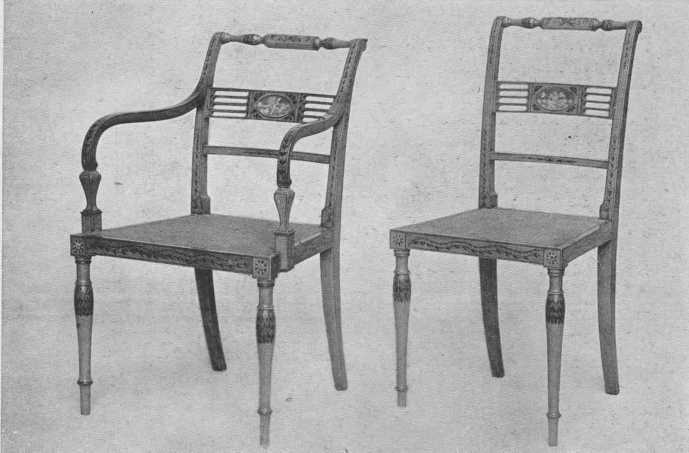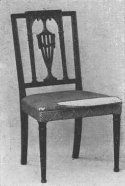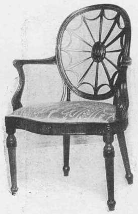 The Adam Brothers, of whom Robert was the more important, showed strong classical influence in their work, and much of it resembles that of Louis XVI, which was influenced from the same source. Chairs had square or round or oval backs, and they also used a lyre-shaped splat which was copied later by Sheraton. Often the top rail was decorated by small and charming painted panels. These little panels were also used in the center of cobweb caning in chair backs and settees. Legs of chairs and tables were tapering and round or square and often reeded or fluted. Adam used much mahogany and kept its beautiful golden brown tone (not the dead brown called "Adam" too often in the shops), and also satin-wood and painted wood. The best artists of the day did the painting. Wedgwood medallions were introduced into the more important pieces of furniture. Painted placques, lovely festoons, and charming groups of figures, vases of flowers, and Wedgwood designs, and designs radiating from a center, as on semicircular console table tops, are all characteristic of his work. He also used much inlay. As Adam usually planned all the furniture and the interior of the house, even to the door-knobs, he kept the feeling of unity in both background and furnishings.