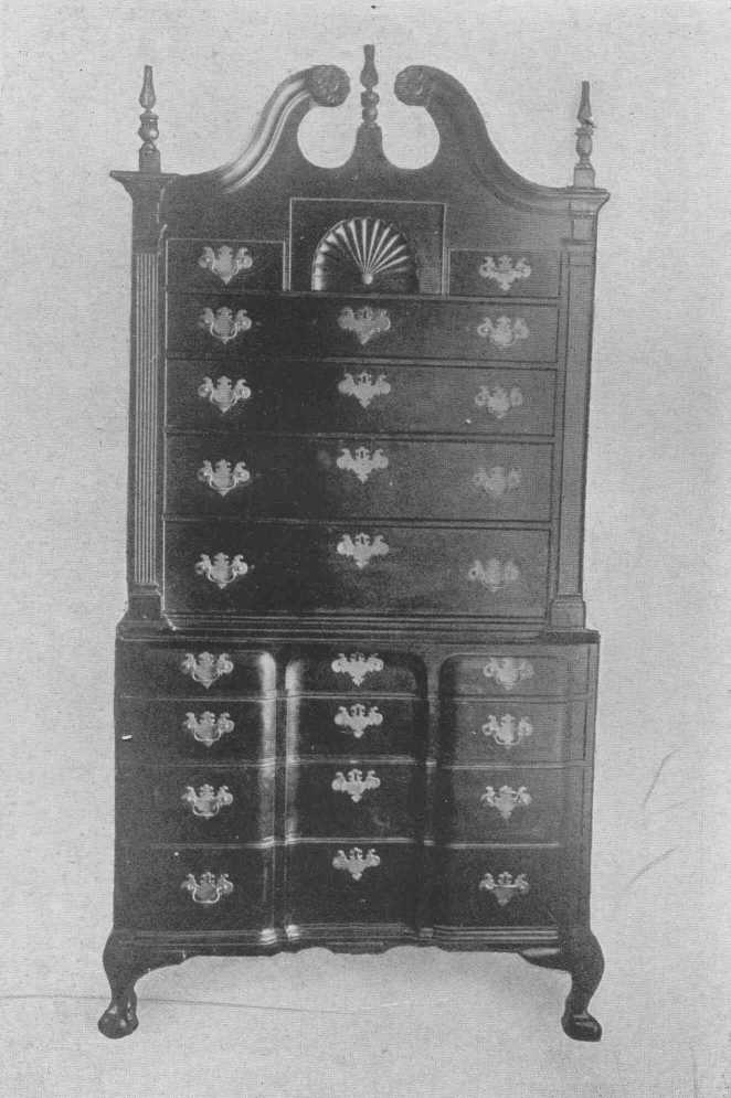 The general proportions, the broken pediment and torch or flame ornaments and drops, large brasses, and cabriole legs all show that this splendid example of a highboy belongs to the same time as the desk, about 1750.