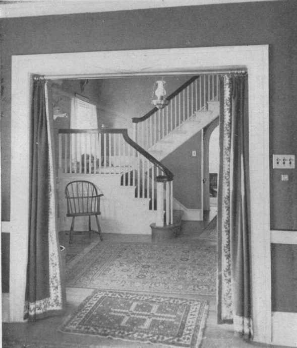 This attractive Colonial hallway shows a good arrangement of rugs. The border on the portières spoils the effect, but the lamp is well chosen.