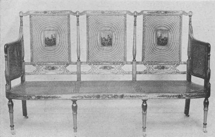A three-chair settee of the Sheraton period, lacquered, and with cane seat. It would be appropriate for a living-room or hall.