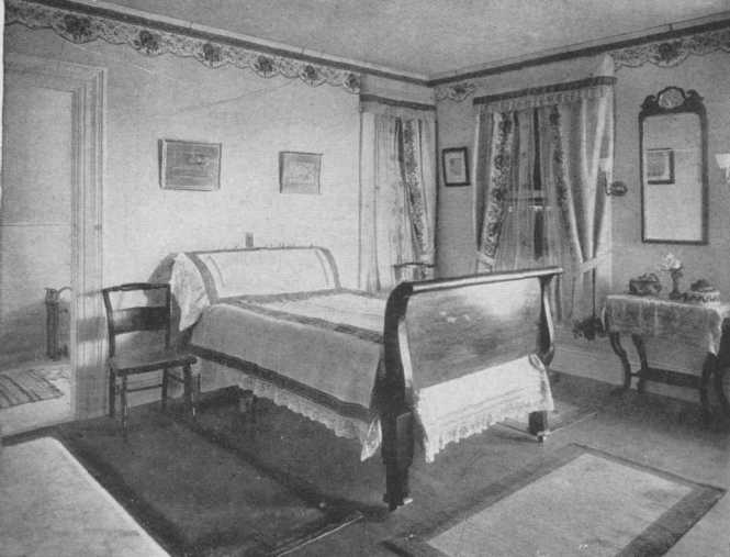 Attractive and inexpensive painted furniture can be made to be used in simple surroundings by buying slat-backed chairs with splint seats and a drop-leaf pine table and having them painted the desired ground color and then striped and decorated with a motif from the chintz to be used in the room. A country house dining-room or bedroom could be most charmingly fitted up in this way, chintz cushions could be used on the chairs, and candle shades could be made to match. One can sometimes find a bed or chest of drawers or other piece of furniture which is a bit shopworn and can be had for a bargain. Old bureaus can be made to serve as chests of drawers by taking the mirror off and using it as a wall mirror. In many houses there are old sets of ugly furniture which can be made useful and often attractive by having the jigsaw carving removed and painting them. In a set of this kind, which I was doing over for a client, there happened to be two beds with towering headboards, quite impossible to use, but I combined the two footboards, thus making one attractive bed. The furniture was painted a soft pumpkin yellow, striped with blue and with little, old-fashioned nosegays, and a lovely linen with yellow and cream stripes and baskets of flowers was used and turned a dark and dreary room into a cheerful and pretty one.