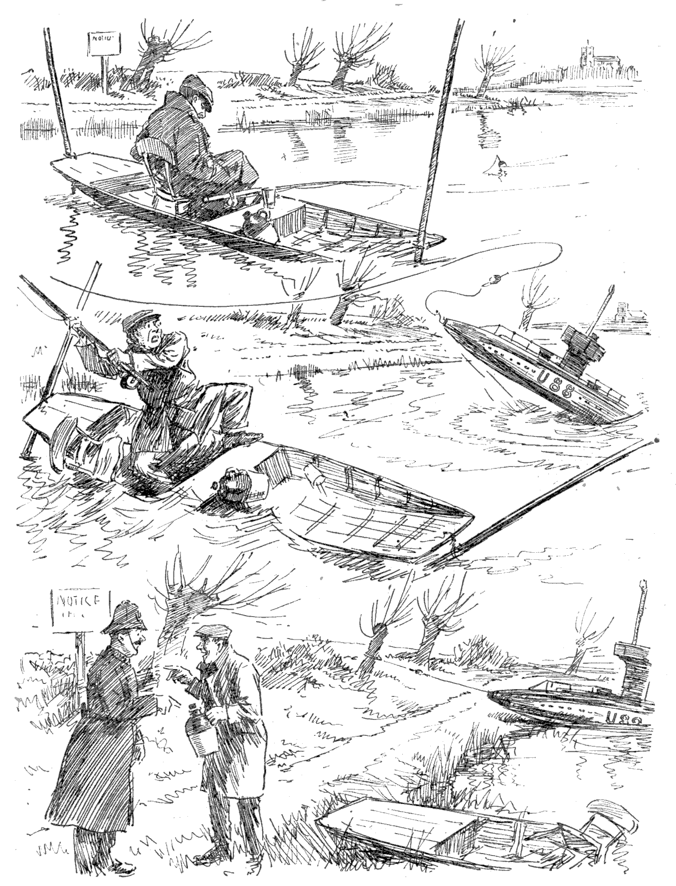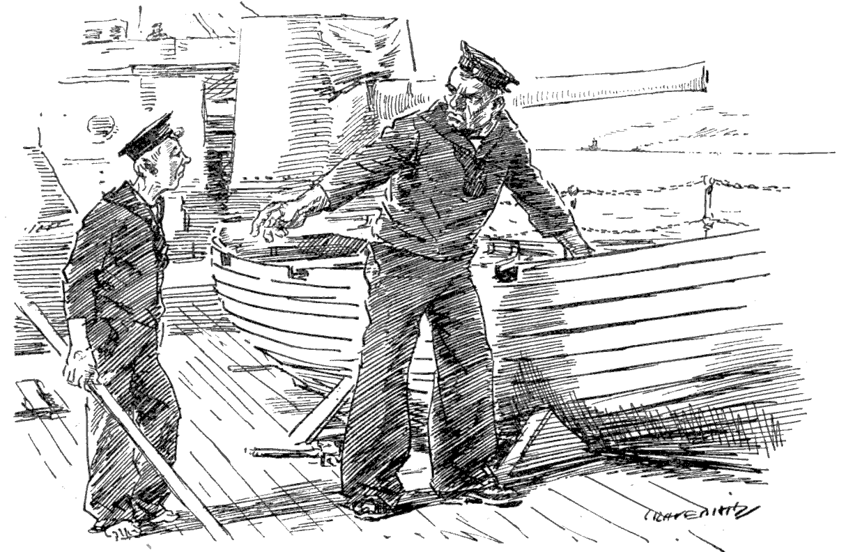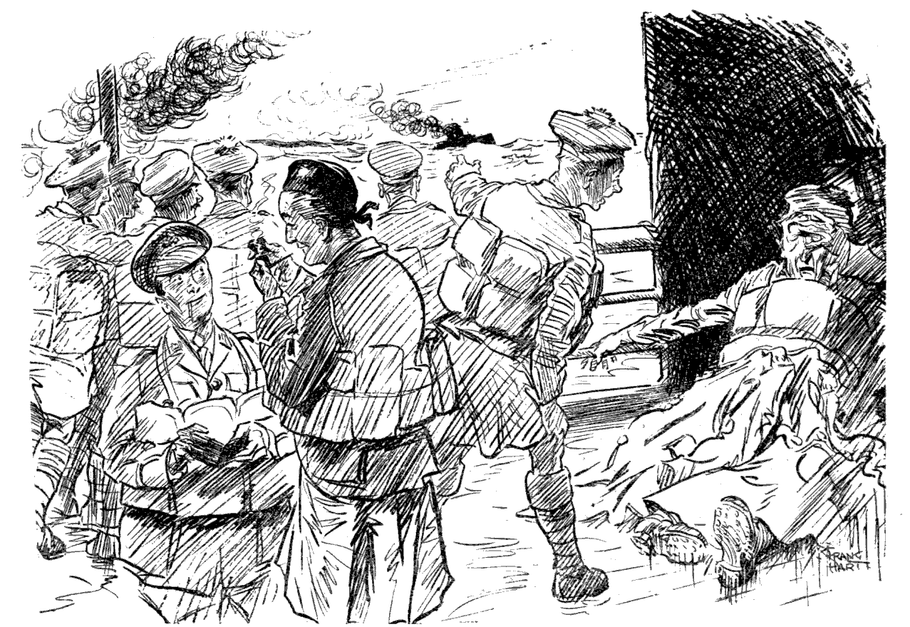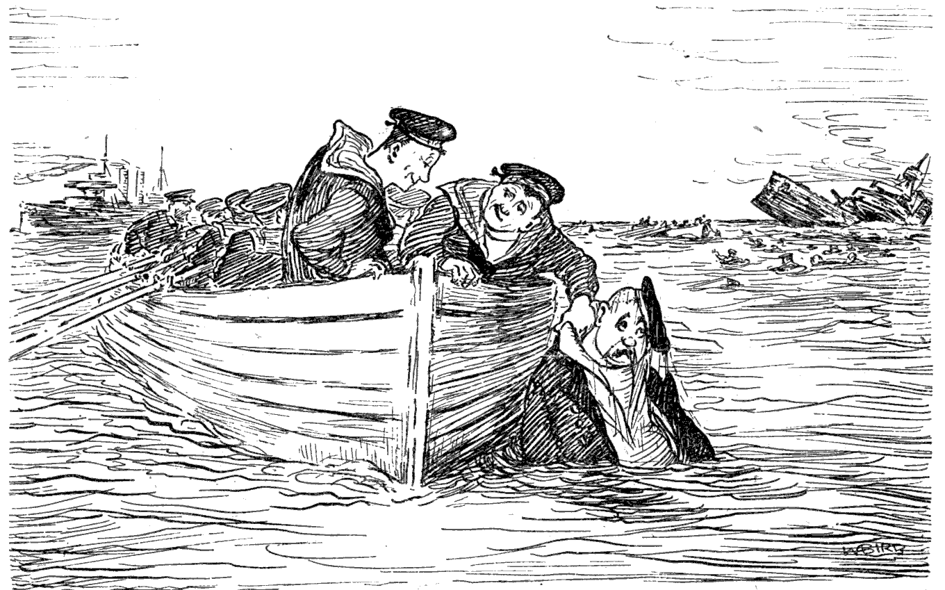Torpedoed mine-sweeper (to his pal). "AS I WAS A-SAYIN', BOB, WHEN WE WAS INTERRUPTED, IT'S MY BELIEF AS 'OW THE SUBMARINE BLOKES AIN'T ON 'ARF AS RISKY A JOB AS THE BOYS IN THE AIRY-O-PLANES."