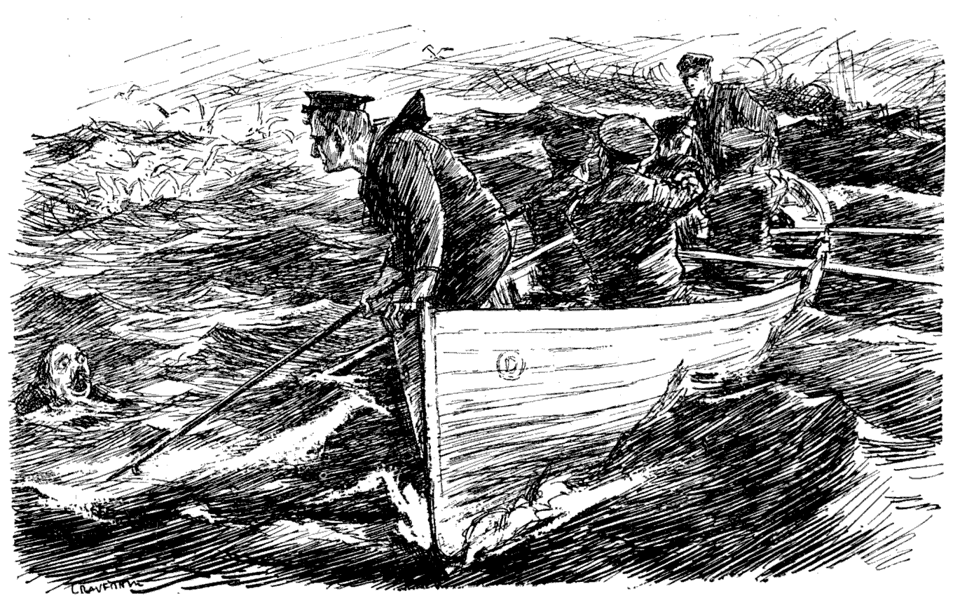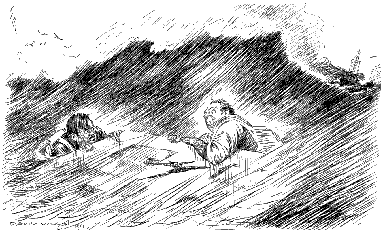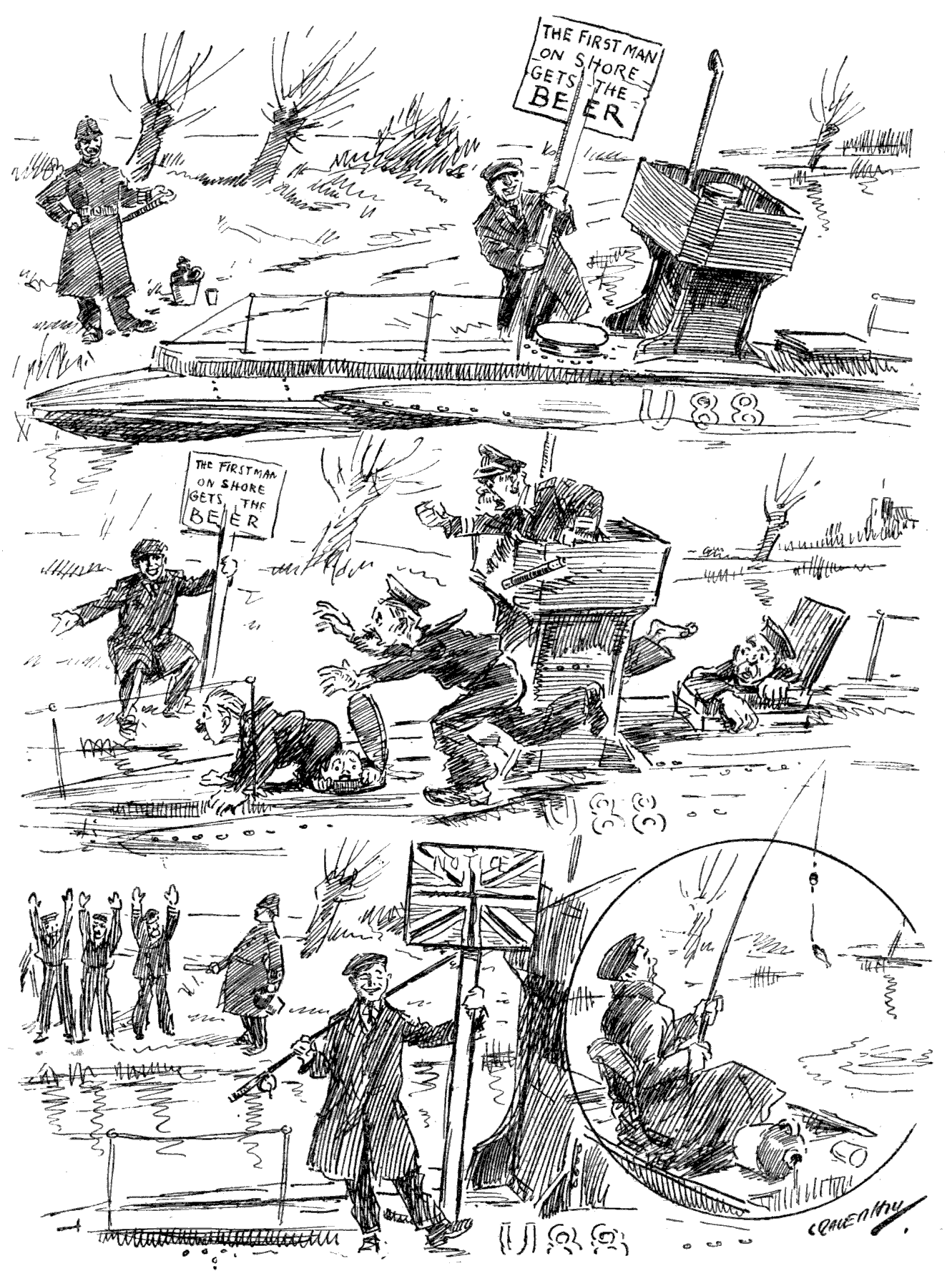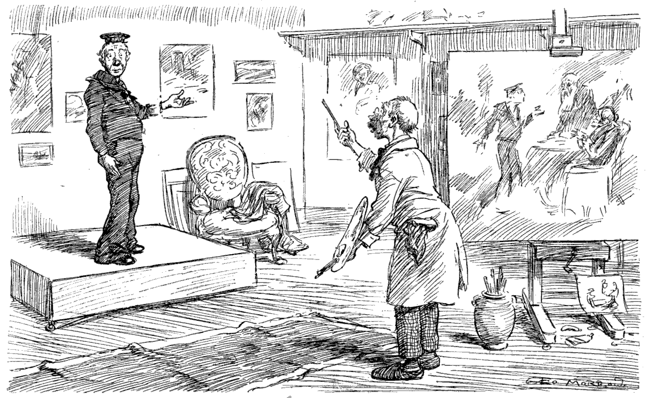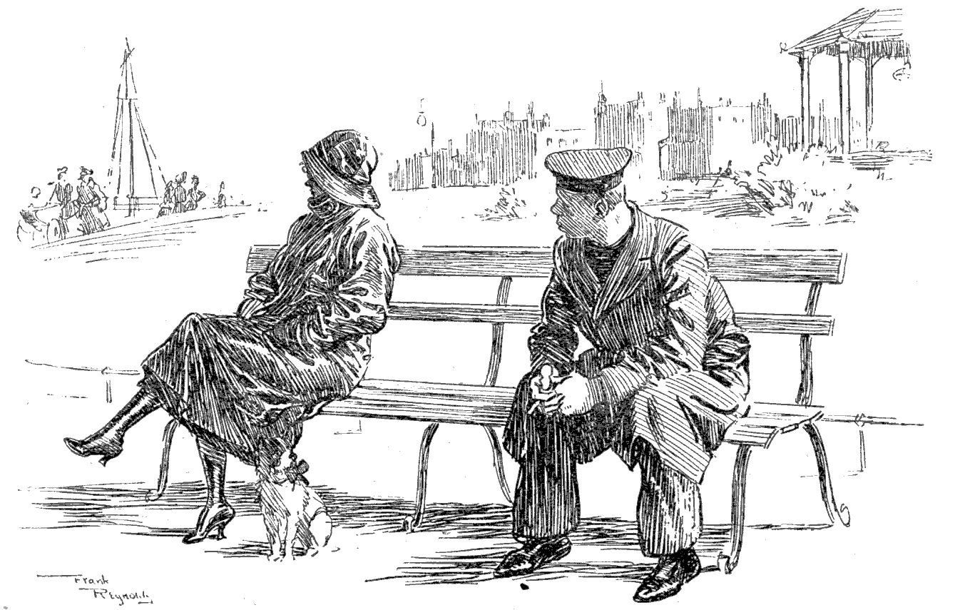 Torpedoed mine-sweeper (to his pal). "AS I WAS A-SAYIN', BOB, WHEN WE WAS INTERRUPTED, IT'S MY BELIEF AS 'OW THE SUBMARINE BLOKES AIN'T ON 'ARF AS RISKY A JOB AS THE BOYS IN THE AIRY-O-PLANES."
