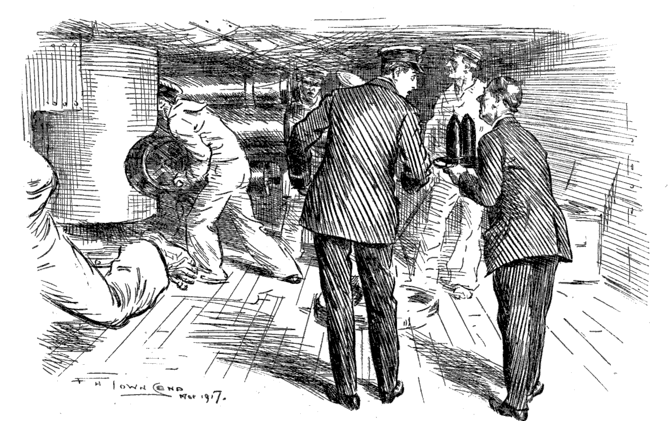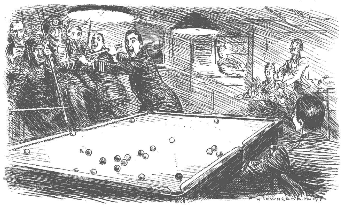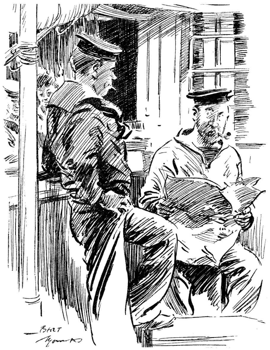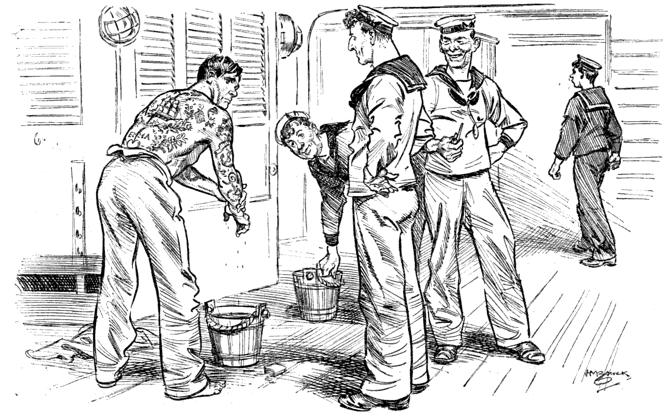 Torpedoed mine-sweeper (to his pal). "AS I WAS A-SAYIN', BOB, WHEN WE WAS INTERRUPTED, IT'S MY BELIEF AS 'OW THE SUBMARINE BLOKES AIN'T ON 'ARF AS RISKY A JOB AS THE BOYS IN THE AIRY-O-PLANES."