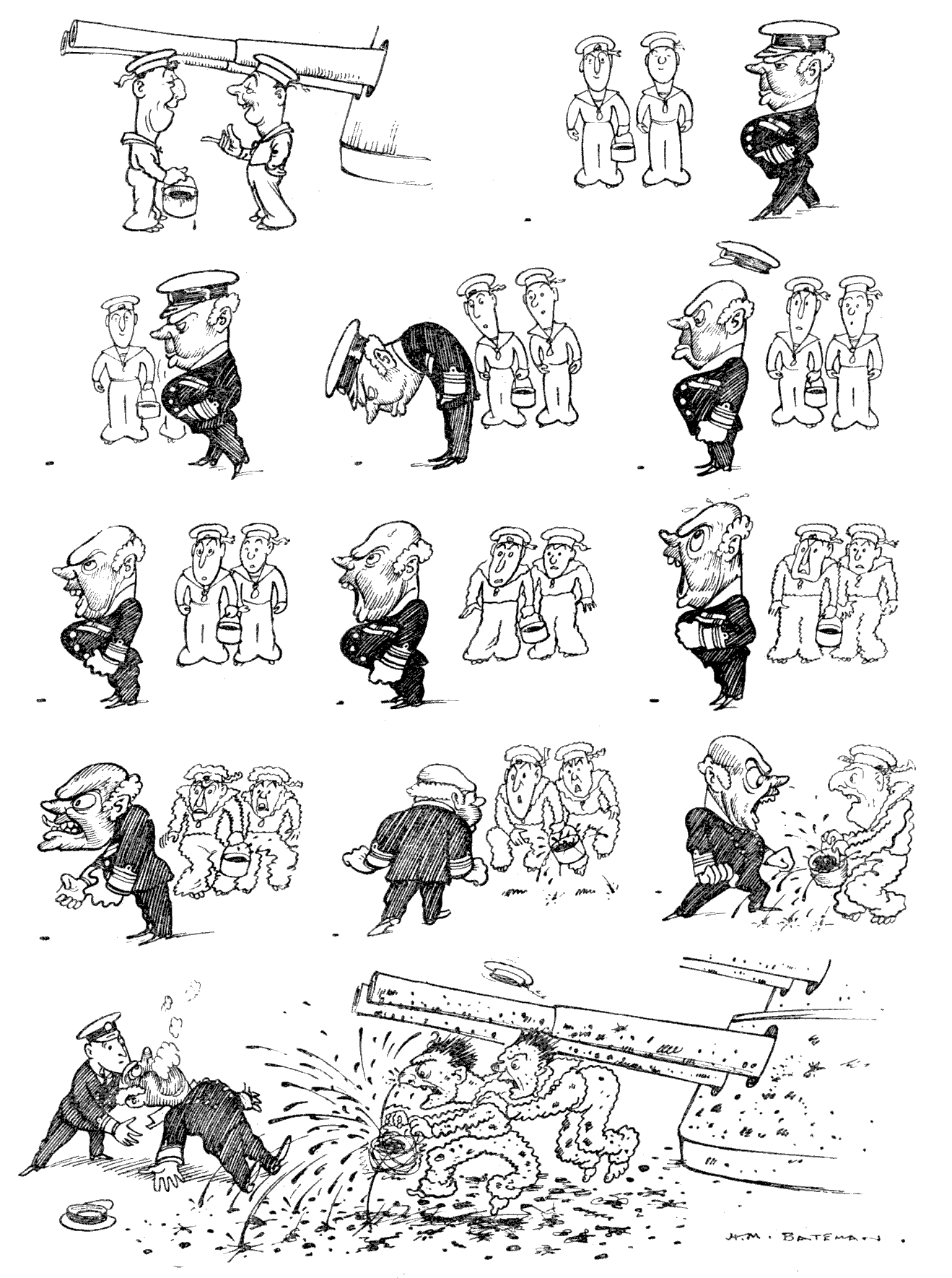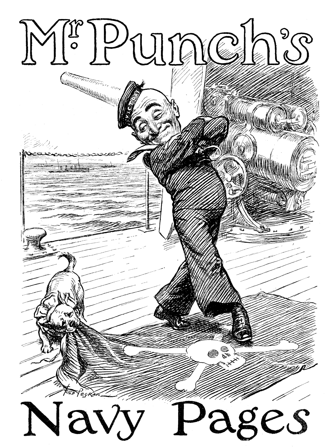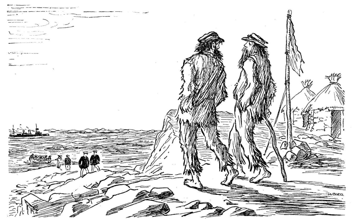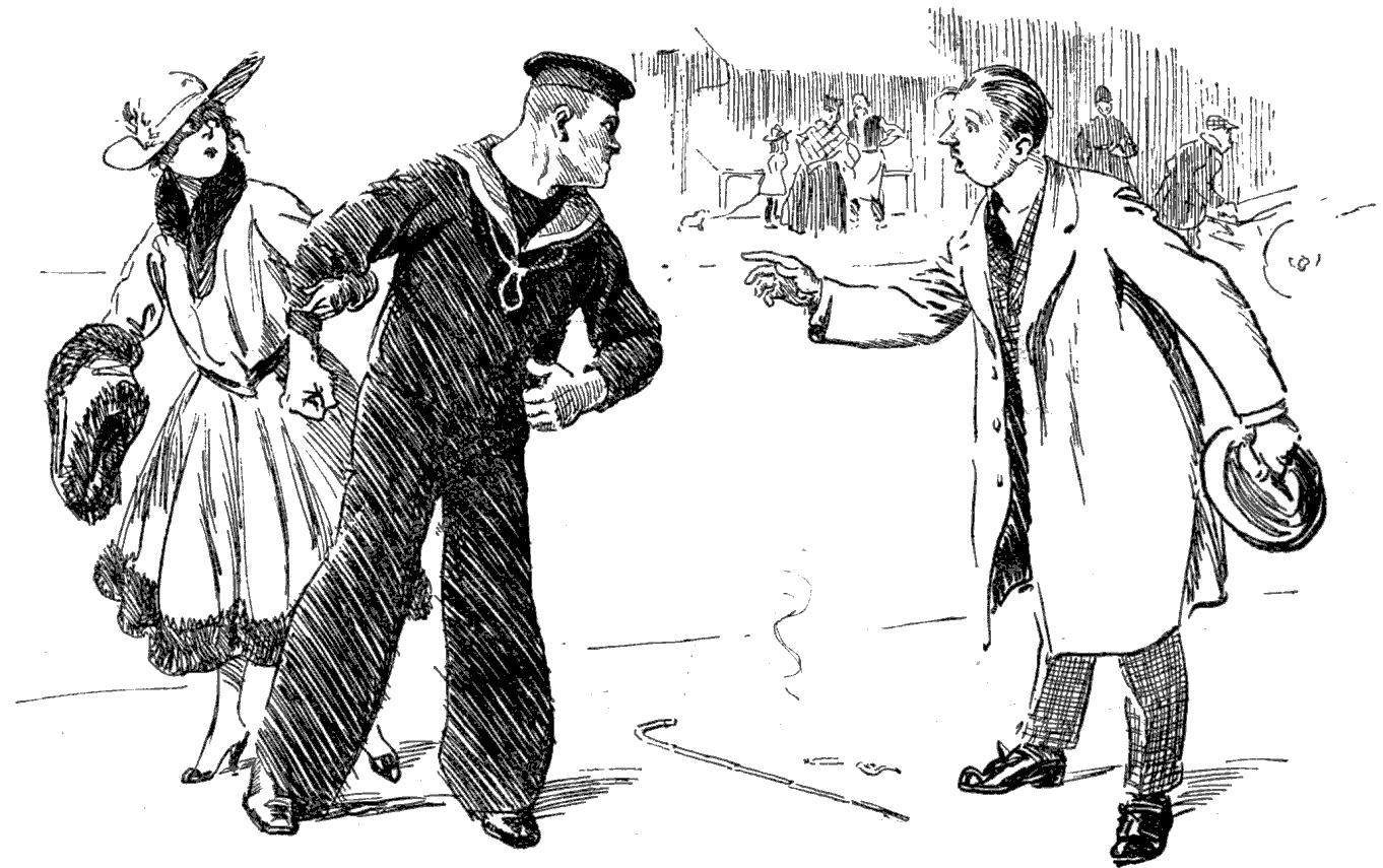 Torpedoed mine-sweeper (to his pal). "AS I WAS A-SAYIN', BOB, WHEN WE WAS INTERRUPTED, IT'S MY BELIEF AS 'OW THE SUBMARINE BLOKES AIN'T ON 'ARF AS RISKY A JOB AS THE BOYS IN THE AIRY-O-PLANES."