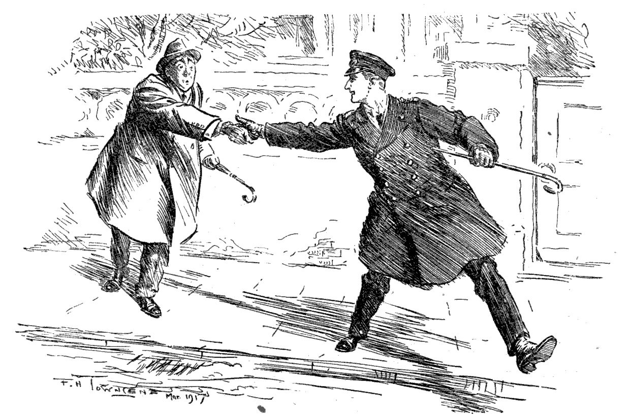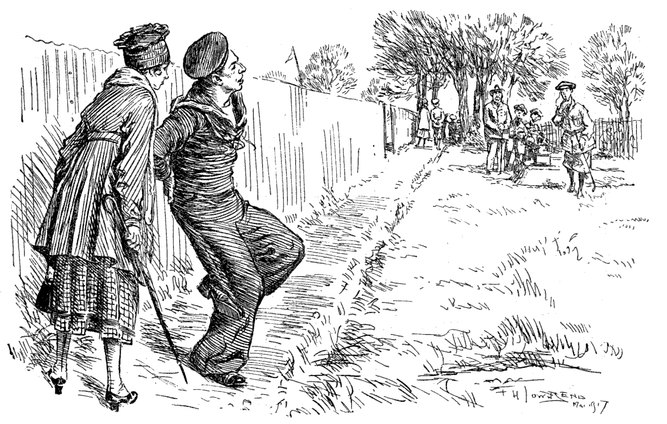 MY DEAR CHARLES,—Recent events calling for strong comment, I turned to my friend, my brick-red friend who is able to retain his well-fed prosperous look notwithstanding the rigours of trench life, Rrobert James McGrregor. I took a map with me and, calling his attention to the general position, asked him what about it? McGregor, as you may guess, is a Scot, whose national sense of economy seems to have spread to his uniform, in that the cap he wears covers but a third-part of his head, and his tunic (which I ought really not to call a tunic but a service jacket) appears to have exhausted itself and its material at the fourth button. Notwithstanding all this, I attach great weight to his truculent views, and, the better to incite him into something outright, addressed him in My best Scottish, which is, at any rate, as good as his best English. "Rrrrrobert," I said, "what like is the VON HINDENBURG line?" Whereupon McGregor, helping himself to our mess whisky and cursing it as the vilest production of this vile War, spoke out.