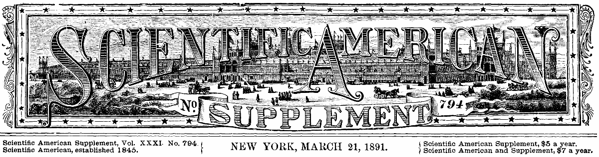 The Project Gutenberg EBook of Scientific American Supplement, No. 794, March 21, 1891, by Various This eBook is for the use of anyone anywhere at no cost and with almost no restrictions whatsoever. You may copy it, give it away or re-use it under the terms of the Project Gutenberg License included with this eBook or online at www.gutenberg.org Title: Scientific American Supplement, No. 794, March 21, 1891 Author: Various Release Date: April 25, 2005 [EBook #15708] Language: English Character set encoding: ISO-8859-1 *** START OF THIS PROJECT GUTENBERG EBOOK SCIENTIFIC AMERICAN *** Produced by Juliet Sutherland and the Online Distributed Proofreading Team at www.pgdp.net.