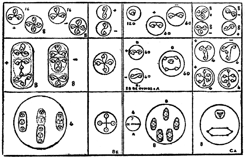 The chemical atom of nitrogen was the third selected by the students for examination, as it seemed comparatively quiet in contrast with the ever-excited oxygen. It proved, however, to be the most complicated of all in its internal arrangements, and its quiet was therefore a little deceptive. Most prominent was the balloon-shaped body in the middle, with six smaller bodies in two horizontal rows and one large egg-shaped one in the midst, contained in it. Some chemical atoms were seen in which the internal arrangement of these contained bodies was changed and the two horizontal rows became vertical; this change seemed to be connected with a greater activity of the whole body, but the observations on this head are too incomplete to be reliable. The balloon-shaped body is positive, and is apparently drawn downwards towards the negative egg-shaped body below it, containing seven smaller particles. In addition to these large bodies, four small ones are seen, two positive and two negative, the positive containing five and the negative four minuter spots. On raising the gaseous atom to E 4, the falling away of the wall sets free the six contained bodies, and both the balloon and the egg round themselves, apparently with the removal of their propinquity, as though they had exercised over each other some attractive influence. The smaller bodies within the egg—marked q on E 4—are not on one plane, and those within n and o form respectively square-based and triangular-based pyramids. On raising all these bodies to E 3 we find the walls fall away as usual, and the contents of each "cell" are set free: p of E 4 contains six small bodies marked k, and these are shown in k of E 3, as containing each seven little bodies—marked e—each of which has within it two ultimate atoms; the long form of p E 4—marked l—appears as the long form l on E 3, and this has three pairs of smaller bodies within it, f', g and h, containing respectively three, four and six ultimate atoms; q of E 4, with its seven contained particles, m, has three particles m on E 3, each showing three ultimate atoms within them; e from n of E 4 becomes i of E 3, with contained bodies, e, showing two ultimate atoms in each; while e' from o of E 4 becomes j of E 3, each having three smaller bodies within it, e', with two ultimate atoms in each. On E 2, the arrangement of these ultimate atoms is shown, and the pairs, f', g and h are seen with the lines of force indicated; the triads in f—from m of E 3—are similarly shown, and the duads in e and e'—from i and j of E 3—are given in the same way. When all these bodies are raised to E 1, the ultimate physical atoms are set free, identical, of course, with that previously described. Reckoning up the number of ultimate physical atoms in a chemical atom of nitrogen we find they amount to 261, thus divided:—