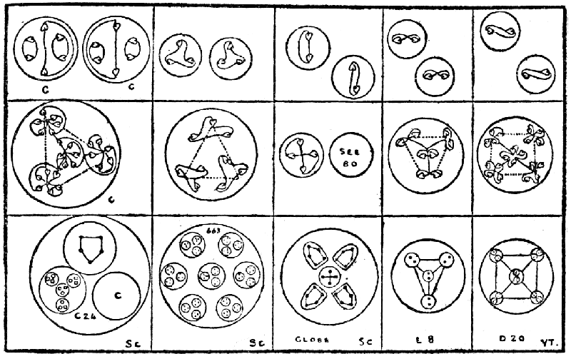 Some other observations were made which went to show that as weight-numbers increased, there was a corresponding increase in the number of bodies discerned within the chemical atom; thus, gold showed forty-seven contained bodies; but these observations need repetition and checking. Investigation of a molecule of water revealed the presence of twelve bodies from hydrogen and the characteristic snake of oxygen, the encircling walls of the chemical atoms being broken away. But here again, further observations are necessary to substantiate details. The present paper is only offered as a suggestion of an inviting line of research, promising interesting results of a scientific character; the observations recorded have been repeated several times and are not the work of a single investigator, and they are believed to be correct so far as they go.