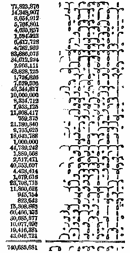 It is easy to prove that the most economical way of reducing addition to counting similar quantities is by the binary arithmetic of Leibnitz, which appears in an altered dress, with most of the zero signs suppressed, in the example below. Opposite each number in the usual figures is here set the same according to a scheme in which the signs of powers of two repeat themselves in periods of four; a very small circle, like a degree mark, being used to express any fourth power in the series; a long loop, like a narrow 0, any square not a fourth power; a curve upward and to the right, like a phonographic l, any double fourth power; and a curve to the right and downward, like a phonographic r, any half of a fourth power; with a vertical bar to denote the absence of three successive powers not fourth powers. Thus the equivalent for one million, shown in the example slightly below the middle, is 216 (represented by a degree-mark in the fifth row of these marks, counting from the right) plus 217 + 29 (two l-curves in the fifth and third places of l-curves) plus 218 + 214 + 26 (three loops) plus 219 (the r-curve at the extreme left); while the absence of 23, 22, and 21 is shown by the vertical stroke at the right. This equivalent expression may be verified, if desired, either by adding the designated powers of two from 524,288 down to 64, or by successive multiplications by two, adding one when necessary. The form of characters here exhibited was thought to be the best of nearly three hundred that were devised and considered and in about sixty cases tested for economic value by actual additions.