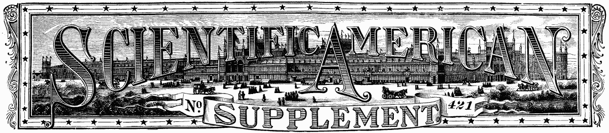 End of the Project Gutenberg EBook of Scientific American Supplement, No. 421, January 26, 1884, by Various *** END OF THIS PROJECT GUTENBERG EBOOK SCIENTIFIC AMERICAN *** ***** This file should be named 16353-h.htm or 16353-h.zip ***** This and all associated files of various formats will be found in: https://www.gutenberg.org/1/6/3/5/16353/ Produced by Juliet Sutherland, Jon Niehof and the Online Distributed Proofreading Team at www.pgdp.net Updated editions will replace the previous one--the old editions will be renamed. Creating the works from public domain print editions means that no one owns a United States copyright in these works, so the Foundation (and you!) can copy and distribute it in the United States without permission and without paying copyright royalties. Special rules, set forth in the General Terms of Use part of this license, apply to copying and distributing Project Gutenberg-tm electronic works to protect the PROJECT GUTENBERG-tm concept and trademark. Project Gutenberg is a registered trademark, and may not be used if you charge for the eBooks, unless you receive specific permission. If you do not charge anything for copies of this eBook, complying with the rules is very easy. You may use this eBook for nearly any purpose such as creation of derivative works, reports, performances and research. They may be modified and printed and given away--you may do practically ANYTHING with public domain eBooks. Redistribution is subject to the trademark license, especially commercial redistribution. *** START: FULL LICENSE *** THE FULL PROJECT GUTENBERG LICENSE PLEASE READ THIS BEFORE YOU DISTRIBUTE OR USE THIS WORK To protect the Project Gutenberg-tm mission of promoting the free distribution of electronic works, by using or distributing this work (or any other work associated in any way with the phrase "Project Gutenberg"), you agree to comply with all the terms of the Full Project Gutenberg-tm License (available with this file or online at https://gutenberg.org/license). Section 1. General Terms of Use and Redistributing Project Gutenberg-tm electronic works 1.A. By reading or using any part of this Project Gutenberg-tm electronic work, you indicate that you have read, understand, agree to and accept all the terms of this license and intellectual property (trademark/copyright) agreement. If you do not agree to abide by all the terms of this agreement, you must cease using and return or destroy all copies of Project Gutenberg-tm electronic works in your possession. If you paid a fee for obtaining a copy of or access to a Project Gutenberg-tm electronic work and you do not agree to be bound by the terms of this agreement, you may obtain a refund from the person or entity to whom you paid the fee as set forth in paragraph 1.E.8. 1.B. "Project Gutenberg" is a registered trademark. It may only be used on or associated in any way with an electronic work by people who agree to be bound by the terms of this agreement. There are a few things that you can do with most Project Gutenberg-tm electronic works even without complying with the full terms of this agreement. See paragraph 1.C below. There are a lot of things you can do with Project Gutenberg-tm electronic works if you follow the terms of this agreement and help preserve free future access to Project Gutenberg-tm electronic works. See paragraph 1.E below. 1.C. The Project Gutenberg Literary Archive Foundation ("the Foundation" or PGLAF), owns a compilation copyright in the collection of Project Gutenberg-tm electronic works. Nearly all the individual works in the collection are in the public domain in the United States. If an individual work is in the public domain in the United States and you are located in the United States, we do not claim a right to prevent you from copying, distributing, performing, displaying or creating derivative works based on the work as long as all references to Project Gutenberg are removed. Of course, we hope that you will support the Project Gutenberg-tm mission of promoting free access to electronic works by freely sharing Project Gutenberg-tm works in compliance with the terms of this agreement for keeping the Project Gutenberg-tm name associated with the work. You can easily comply with the terms of this agreement by keeping this work in the same format with its attached full Project Gutenberg-tm License when you share it without charge with others. 1.D. The copyright laws of the place where you are located also govern what you can do with this work. Copyright laws in most countries are in a constant state of change. If you are outside the United States, check the laws of your country in addition to the terms of this agreement before downloading, copying, displaying, performing, distributing or creating derivative works based on this work or any other Project Gutenberg-tm work. The Foundation makes no representations concerning the copyright status of any work in any country outside the United States. 1.E. Unless you have removed all references to Project Gutenberg: 1.E.1. The following sentence, with active links to, or other immediate access to, the full Project Gutenberg-tm License must appear prominently whenever any copy of a Project Gutenberg-tm work (any work on which the phrase "Project Gutenberg" appears, or with which the phrase "Project Gutenberg" is associated) is accessed, displayed, performed, viewed, copied or distributed: This eBook is for the use of anyone anywhere at no cost and with almost no restrictions whatsoever. You may copy it, give it away or re-use it under the terms of the Project Gutenberg License included with this eBook or online at www.gutenberg.org 1.E.2. If an individual Project Gutenberg-tm electronic work is derived from the public domain (does not contain a notice indicating that it is posted with permission of the copyright holder), the work can be copied and distributed to anyone in the United States without paying any fees or charges. If you are redist