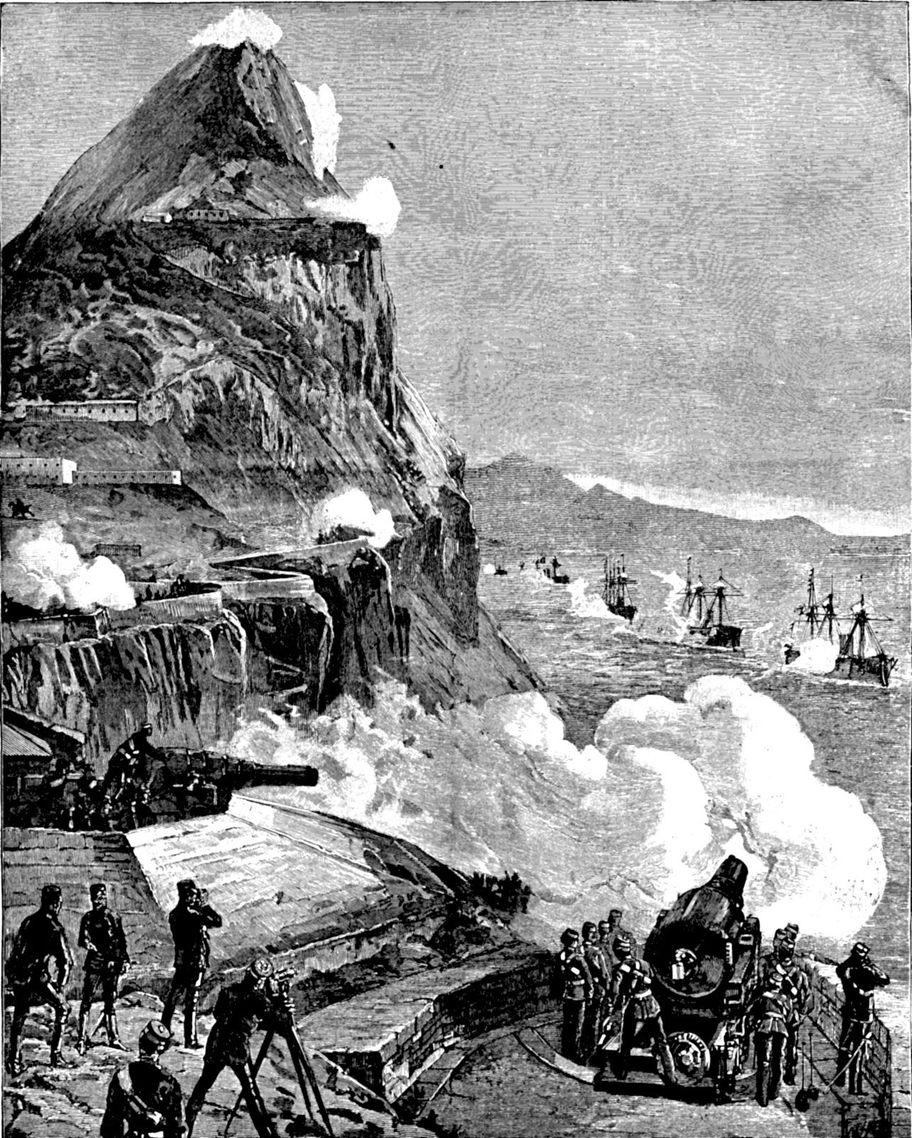 The various batteries on the Rock replied with great vivacity, and the general effect produced as gun after gun was brought to bear on the ships, and the white smoke wreathed itself round the many crags and precipices of the grim old Rock, was a sight long to be remembered. The exercise afforded to both branches of the service was undoubtedly most instructive. Our illustration is a sketch by Captain Willoughby Verner from one of the batteries above the Europa Flats, at which point the governor took up his position to watch the operations.—Illustrated London News.