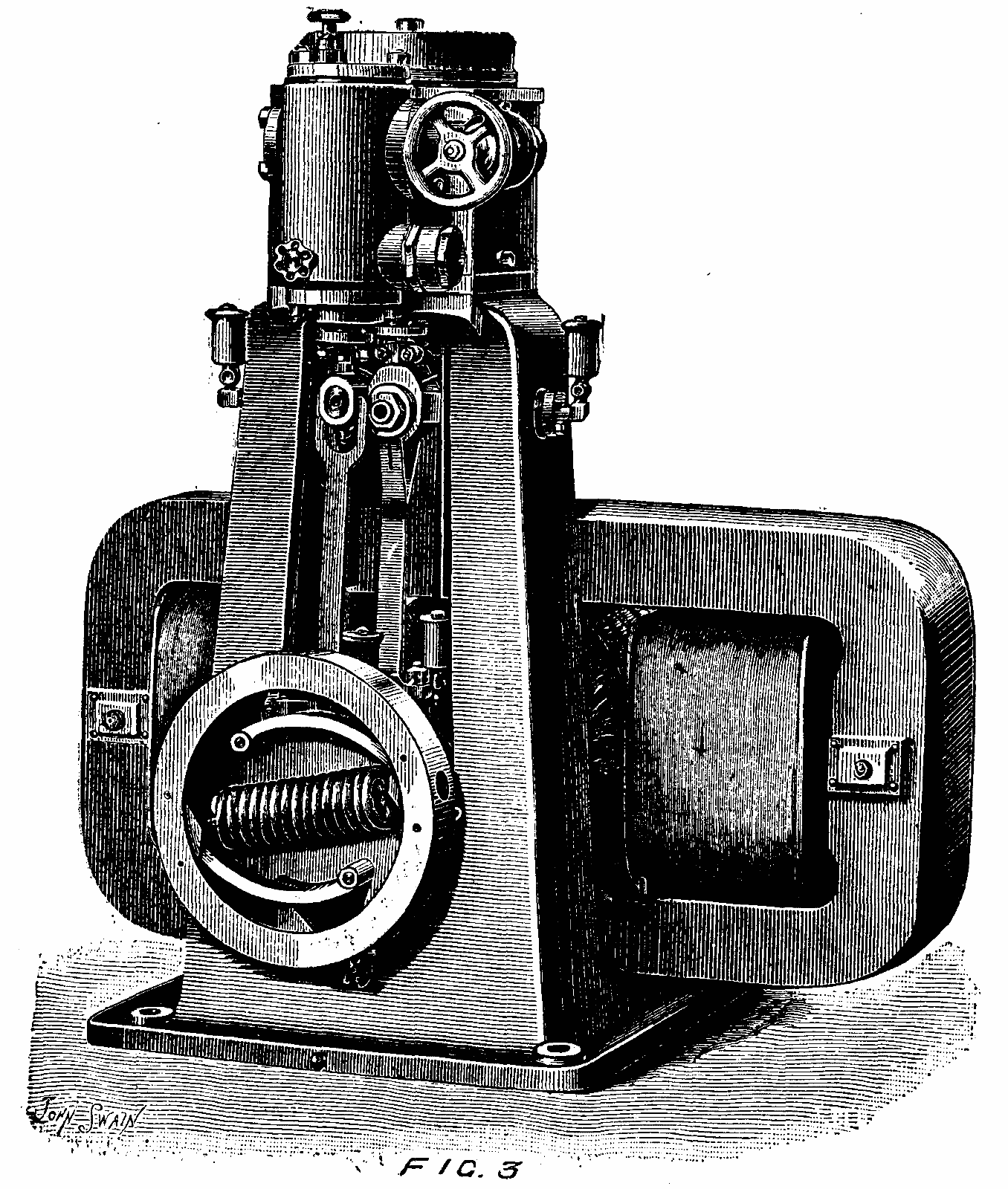 The section of iron in the field is 60 square inches and rectangular in form, and the whole machine measures 4 ft. 3 in. in length, and 2 ft. in height, without including the height of the bed plate. The armature is 17 in. in length and the same in diameter, measured over the winding, and develops at the machine terminals 70 volts and 200 amperes at 480 revolutions. The moving parts of the engine are well balanced, and run remarkably well and without noise at this high rate of speed.