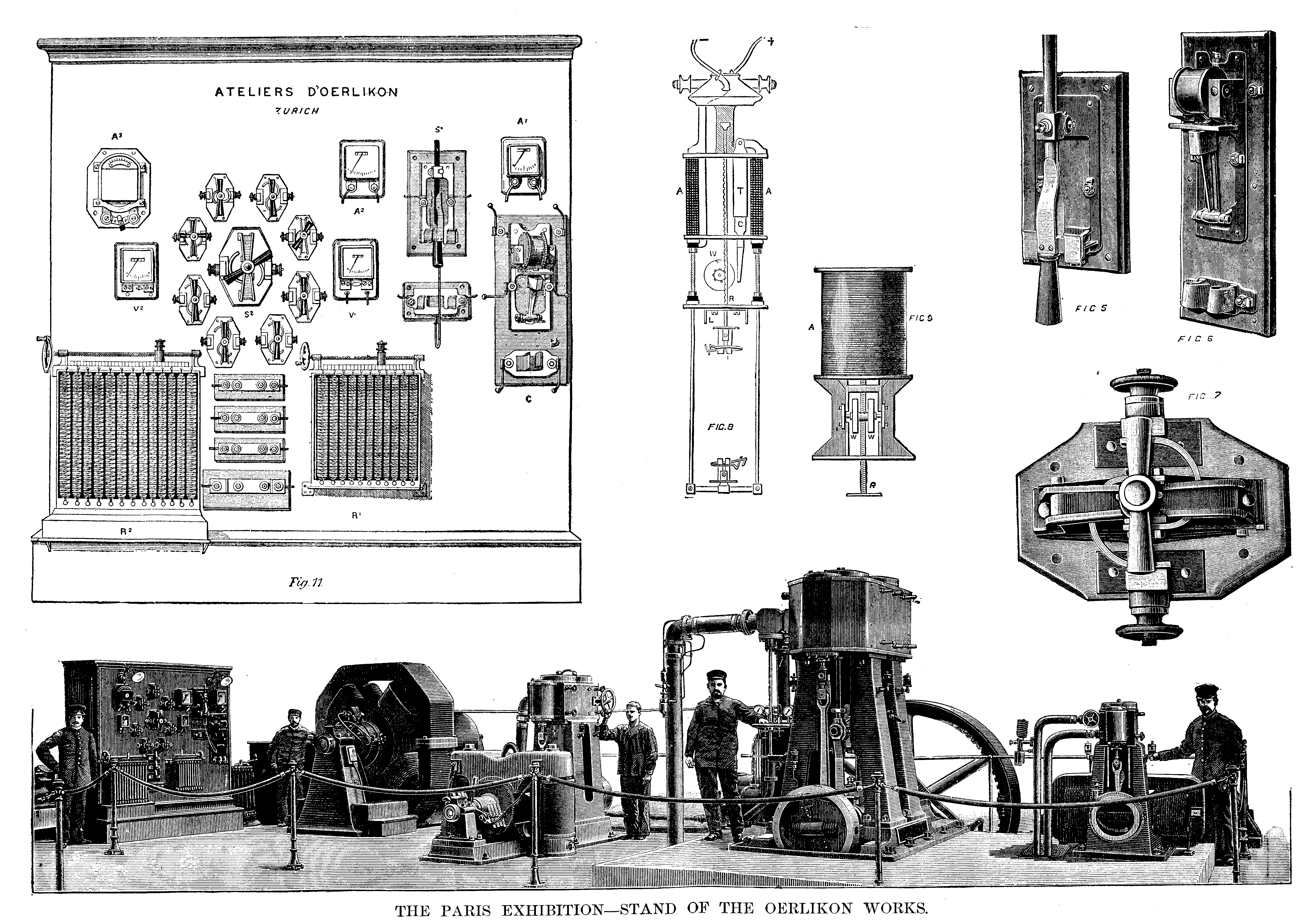 This dynamo serves to develop power to run a motor in an adjoining inclosure, containing some fine specimens of lathes and machine tools constructed by the Oerlikon Works. These are driven by the motor through the medium of a countershaft, and the power and speed are controlled from the switch board seen at the left of the exhibit, and in Fig. 11. The resistance, R1, serves to vary the intensity of the shunt field of the dynamo, the volts being indicated by the voltmeter V1, and a resistance separate from the switch board is inserted in the main circuit of the two machines. The ammeter, A2, is directly connected to the dynamo, and therefore indicates the current, whatever circuit this machine is running.