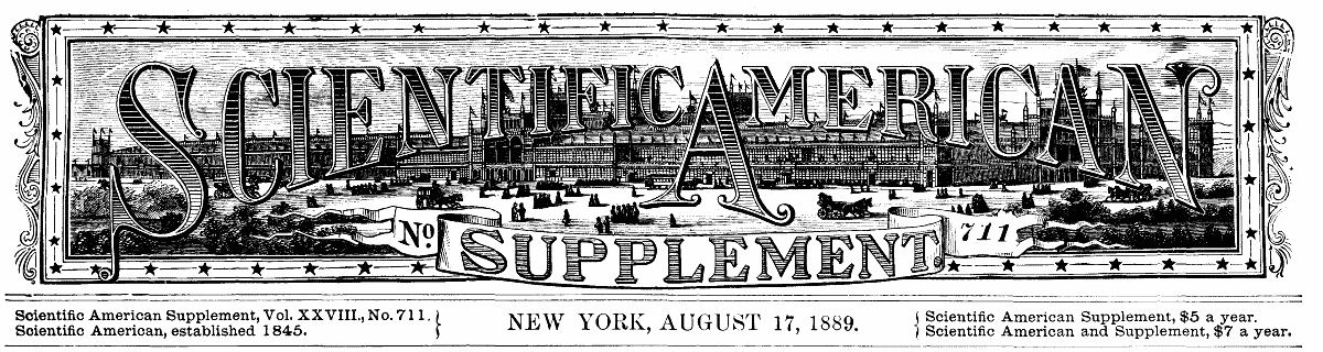 The Project Gutenberg EBook of Scientific American Supplement, No. 711, August 17, 1889, by Various This eBook is for the use of anyone anywhere at no cost and with almost no restrictions whatsoever. You may copy it, give it away or re-use it under the terms of the Project Gutenberg License included with this eBook or online at www.gutenberg.org Title: Scientific American Supplement, No. 711, August 17, 1889 Author: Various Release Date: October 31, 2005 [EBook #16972] Language: English Character set encoding: ISO-8859-1 *** START OF THIS PROJECT GUTENBERG EBOOK SCIENTIFIC AMERICAN *** Produced by Juliet Sutherland and the Online Distributed Proofreading Team at www.pgdp.net