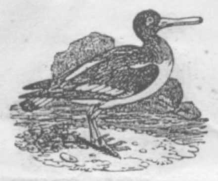 The Oyster Catcher feeds generally on shell-fish, oysters, limpets, &c. He detaches them from the rocks to which they are fastened, and opens them with his long, stout bill. The head, neck, and body are black. It lays two olive-brown eggs, spotted with black.