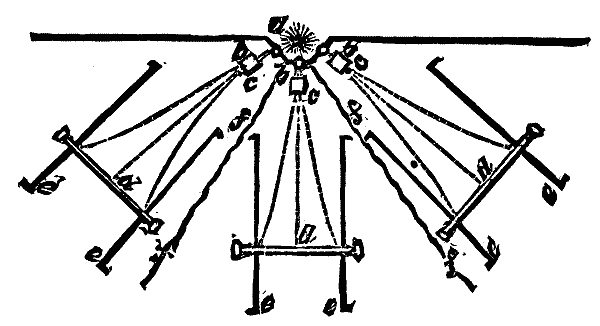 The remarkable coolness of the electric light, as compared with its volume by gas, is also due in a great measure to the conspicuous absence of that large excess of less refrangible, or heat-radiating principle, which distinguishes almost equally all other modes of artificial illumination. After the foregoing statement it may seem a paradox to claim that the electric arc develops the greatest heat with which we have yet had to deal, but this is so; and the heat has an intensity quite beyond the reach of accurate measurement by any instrument now known—it has been variously estimated anywhere between 5,000° and 50,000° F. It is sufficient for our present purpose to know that the most refractory substances quickly disappear when brought under its influence—even the imperial diamond must succumb in a short time. In order to reconcile this fact with its coolness as an illuminating agent, we have to take into consideration the extreme smallness of the point from which the light radiates in the electric arc. A light having the power of many thousand candles will expose but a fraction of the surface for heat radiation which is shown by one gas-jet, and, as I have endeavored to explain, these rays contain very much less of the heating principle than those from gas or other artificial light.