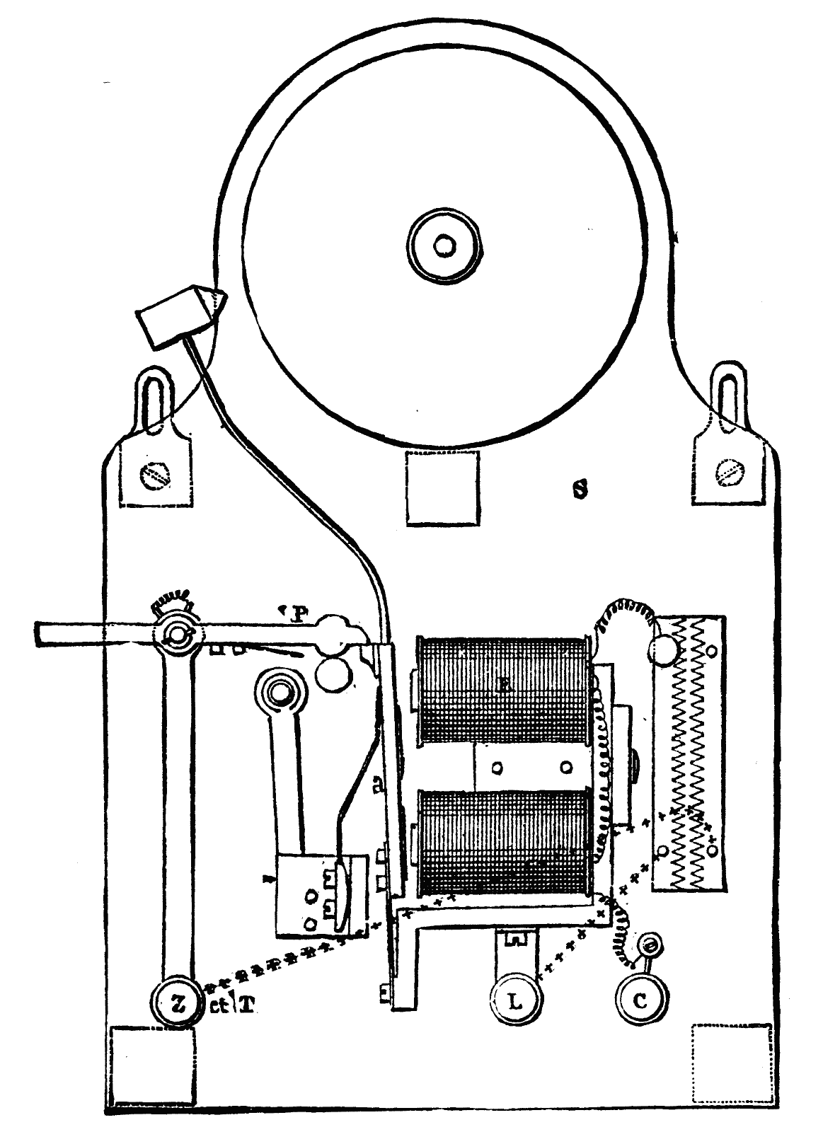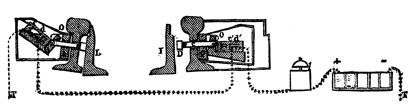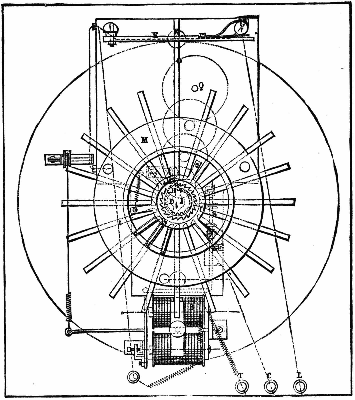 Fig. 13 represents the interior of an apparatus for twenty messages. It consists of a key-board, M, an electro-magnet, B, a clock-work movement, Q, an escapement, s, and an interrupter, F G.