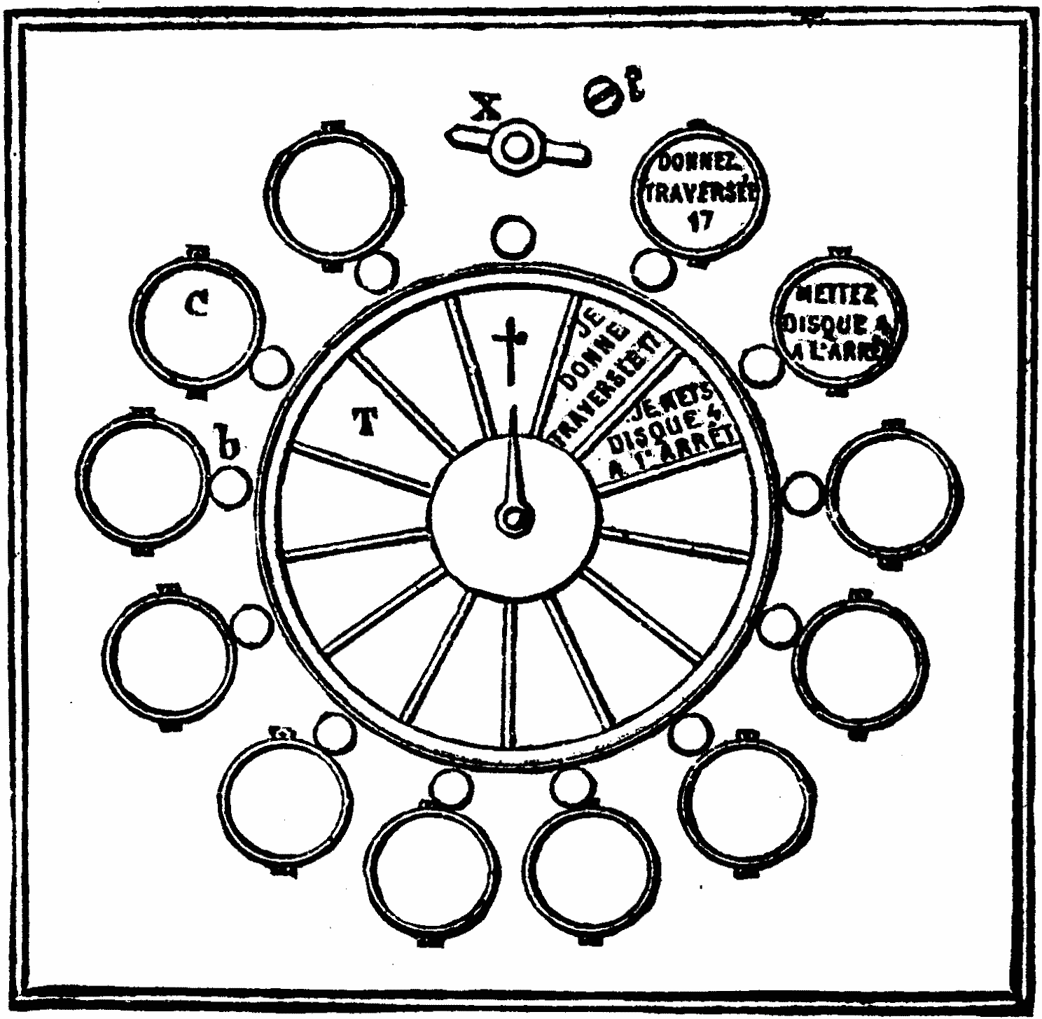 1. The Guggemos Apparatus.—This apparatus serves at once as a manipulator and receiver, and consists of an inner movement surmounted by a dial, over the face of which moves an index hand. Around the circumference of the dial there is arranged a series of circular cases, C, containing the messages to be received, and similar triangular cases, containing the messages to be forwarded, radiating from the center of the dial. Between each of these there is a button, b.