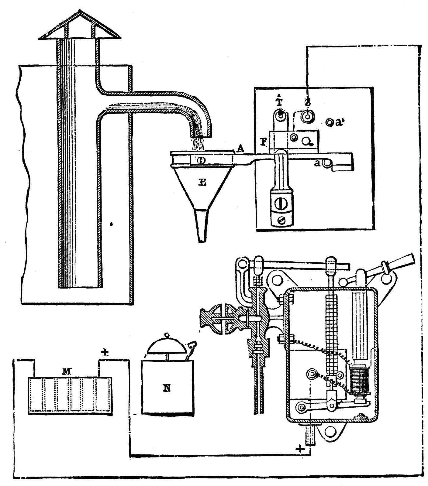 1. The Lartigue Controller (Fig. 15).—This apparatus consists of a long lever, A, which carries at one of its extremities a funnel, E, having a very narrow orifice and which is placed under the overflow pipe of the tank. The lever is kept normally in a horizontal position by a counterpoise; but, as soon as the overflow runs into the funnel, the weight of the water tilts the lever, and the mercurial commutator, F, closes the circuit of a pile, which actuates an alarm-bell located near the pump and engine. The two stops, a and a', limit the play of the lever.