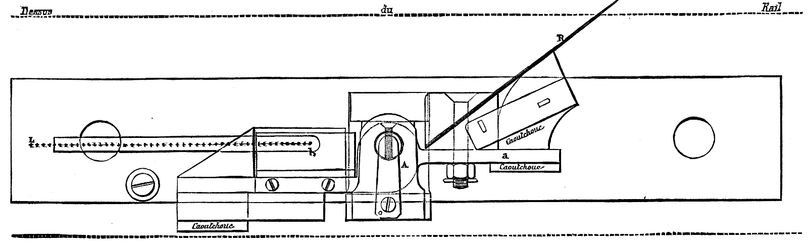1. The first of these, which is generally placed at about 6,000 feet from the point to be covered, consists (Figs. 5, 6, 7, and 8) of a very light pedal fixed to the inside of the rail, and acting upon a mercurial commutator. A spring, R, carried upon the arm, a, of a lever, A, projects slightly above the level of the rail, while the other arm, b, carries a commutator.