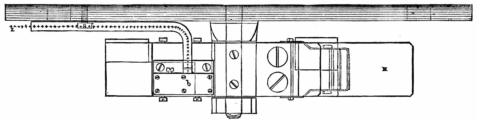 The connections of the machine, which are shown in Fig. 3, are made as follows: The positive current, entering by the attachment screw, h, passes by a wire to the right hand commutator screw, l, to the right-hand roller, k, through the commutator to the ring, around which it traverses to the left-hand roller, k¹, and screw, l¹, to the magnet coil, A, and thence through the coil of the magnet, B, to the terminal screw, h, on the right hand of the figure. This method of coupling up is of very great historical interest, for it is the first instance on record of the magnet coils and armature of a machine being included in one circuit, giving to it the principle of construction of a dynamo-electric machine, and antedating in publication, by two years, the interesting machines of Siemens, Wheatstone, and Varley, and preceding them in construction by a still longer period.
