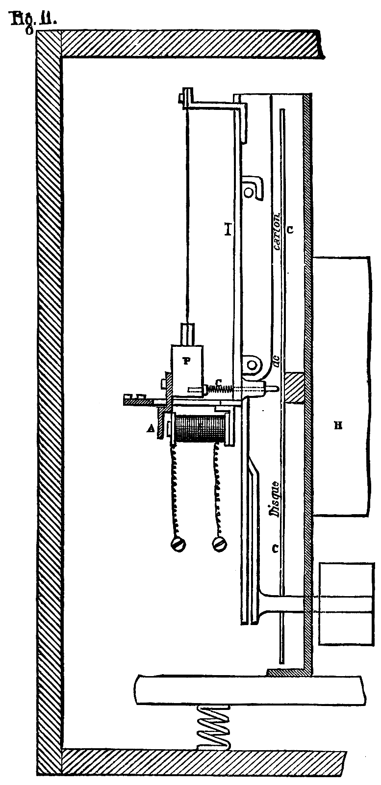 The Brunot Controller as a Controller of the Passage of Trains.—The Brunot Controller, which has been employed for several years on the Railway of the North, is designed to control the regularity of the running of trains, and to make automatically a contradictory verification of the figures on the slips carried by the conductors. In Fig. 11 we give a longitudinal section of the apparatus. It consists of a wooden case containing a clockwork movement, H, upon the axle of which is mounted a cardboard disk, C, divided into hours and minutes, and regulated like a watch, that is to say, making one complete revolution in twelve hours. The metallic pencil, c, which is capable of displacing itself on the cardboard in a horizontal direction opposite a groove on the other side of the disk, traces, when pressure is brought to bear on it, a spiral curve. The transverse travel of the pencil is effected in ninety-six hours. The displacement of the pencil is brought about by means of a cam. Under the influence of the jarring of the train in motion, a weight, P, suspended from a flexible strip, l, strikes against the pencil, c, which traces a series of points. During stoppages there is, of course, an interruption in the tracing of the curve.