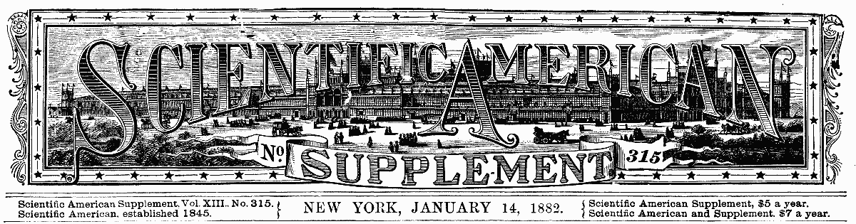 The Project Gutenberg EBook of Scientific American Supplement, No. 315, January 14, 1882, by Various This eBook is for the use of anyone anywhere at no cost and with almost no restrictions whatsoever. You may copy it, give it away or re-use it under the terms of the Project Gutenberg License included with this eBook or online at www.gutenberg.org Title: Scientific American Supplement, No. 315, January 14, 1882 Author: Various Release Date: May 8, 2006 [EBook #18345] Language: English Character set encoding: ISO-8859-1 *** START OF THIS PROJECT GUTENBERG EBOOK SCIENTIFIC AMERICAN *** Produced by Juliet Sutherland and the Online Distributed Proofreading Team at www.pgdp.net