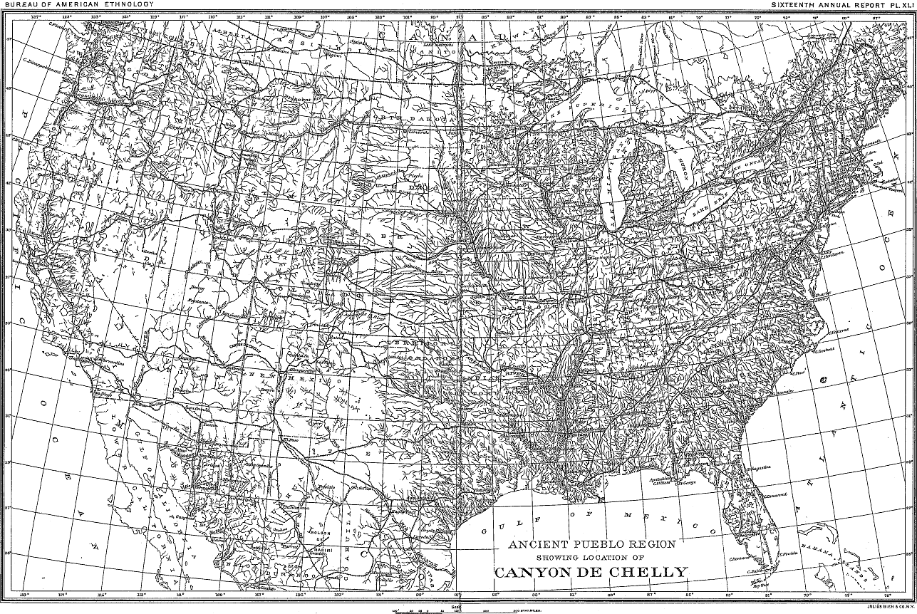 | Plate XLI. | Map of the ancient pueblo region, showing location of Canyon de Chelly |