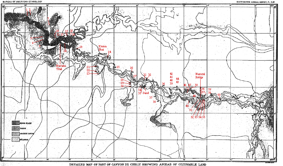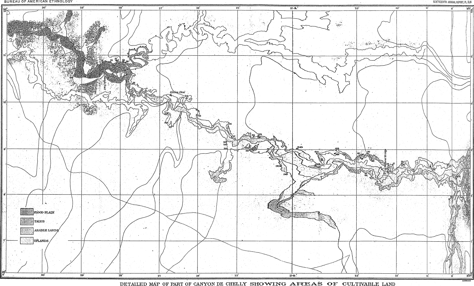 | XLIII. | Detailed map of part of Canyon de Chelly, showing areas of cultivable land |