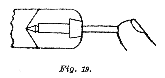 The center, or cone for the reception of the pivot, should be turned out with the graver at an angle of about 60° and such a graver as is shown at B, Fig. 1, will answer[Pg 34] admirably for this purpose. After you have carefully centered your wax chuck, place a small alcohol lamp under the chuck and heat it until the wax will just become fluid and yet not be hot enough to burn the wax. Revolve the lathe slowly and insert the staff so that the pivot rests squarely and firmly in the center. Now re-heat the chuck carefully in order that the wax may adhere firmly to the staff, keeping the lathe revolving meanwhile, but not so fast that the wax will be drawn from the center, and at the same time apply the forefinger to the end of the staff, as shown in Fig. 18 and 19, and gently press it squarely into place in the wax chuck. The lines in Fig. 18 and 19 designate about the right amount of wax after the work is ready, but it is well to add a little more than is shown in those figures, and you should be careful to keep the wax of equal bulk all around, or when it cools it will have a tendency to draw the staff to one side. Now remove the lamp and keep the lathe revolving until the wax is quite cool, when it should be removed, by means of a graver, down to the dimensions designated by the lines in Fig. 18 and 19. When this is accomplished re-heat a little, but only enough to make it soft, but not liquid, and placing a sharpened peg-wood on the tool rest proceed to the final truing up, by resting the pointed end against the hub.