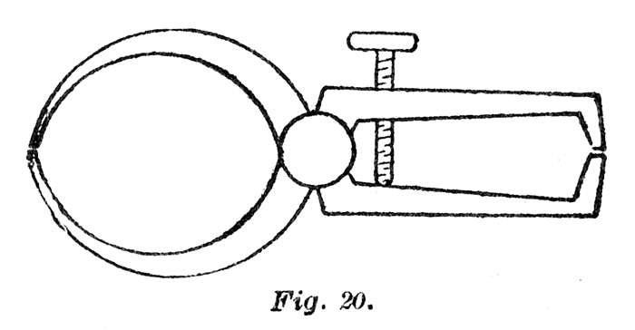 A very handy tool for the purpose of making these length measurements can be constructed by adding a stop screw to the common double calipers as shown in Fig. 20 . The improvement consists in the fact that they can be opened to remove from the work and closed again at exactly the same place, so that an accurate measurement can be made.