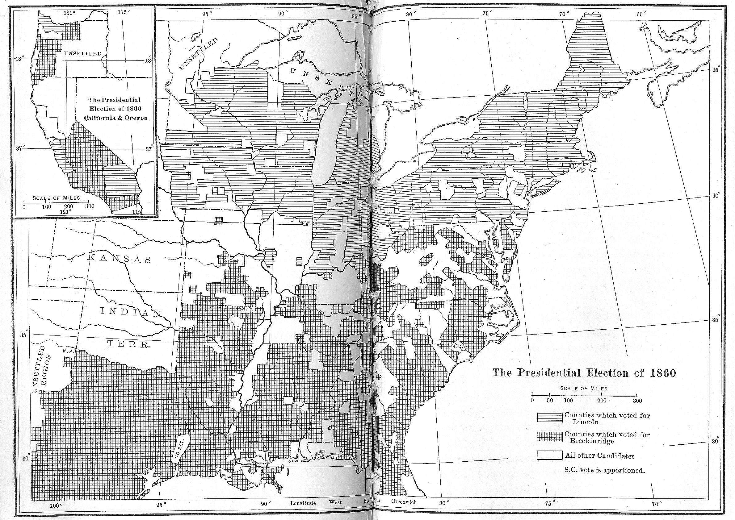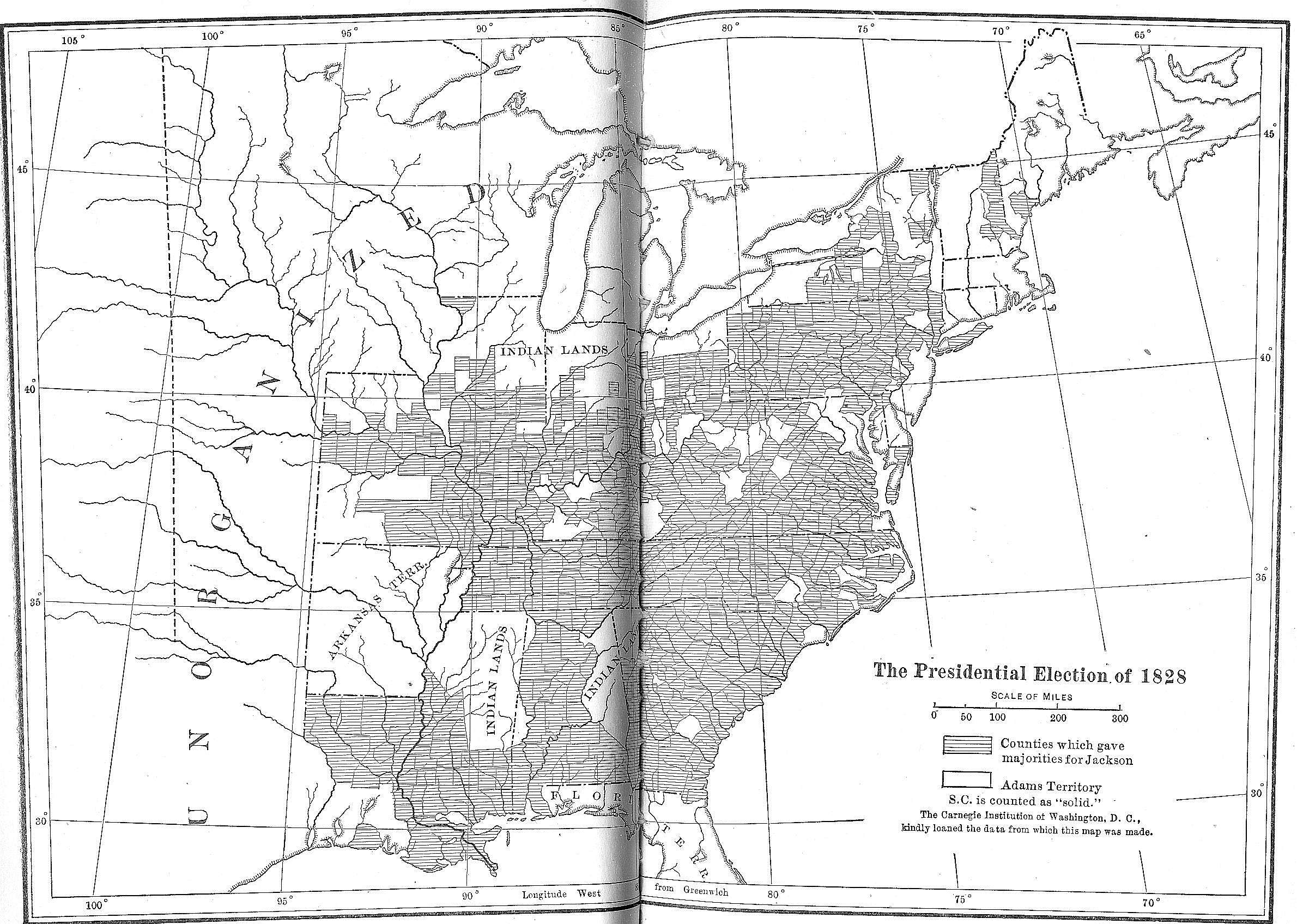 With these backwoods States thus devoted to the man to whom Chief Justice Marshall had sorrowfully administered the oath of office, it was easy for the leaders of the new régime to make strong appeal[Pg 23] to the mountain counties of the Middle States and South, whose political idol had been Thomas Jefferson and whose people were only a generation removed from the pioneer stage of development. With the exception of some of the New England émigrés of western New York, the peasant proprietors of all the up-country counties of the Middle States gave Jackson their allegiance; while south of Maryland, except in a few counties of western Virginia, almost every man in the hill country was a stanch defender of the first Western President. Thus in the West and in the interior of the States which bordered upon the Alleghany Mountains, Jackson had a great compact following which for years to come was to give him the advantage over all his opponents.