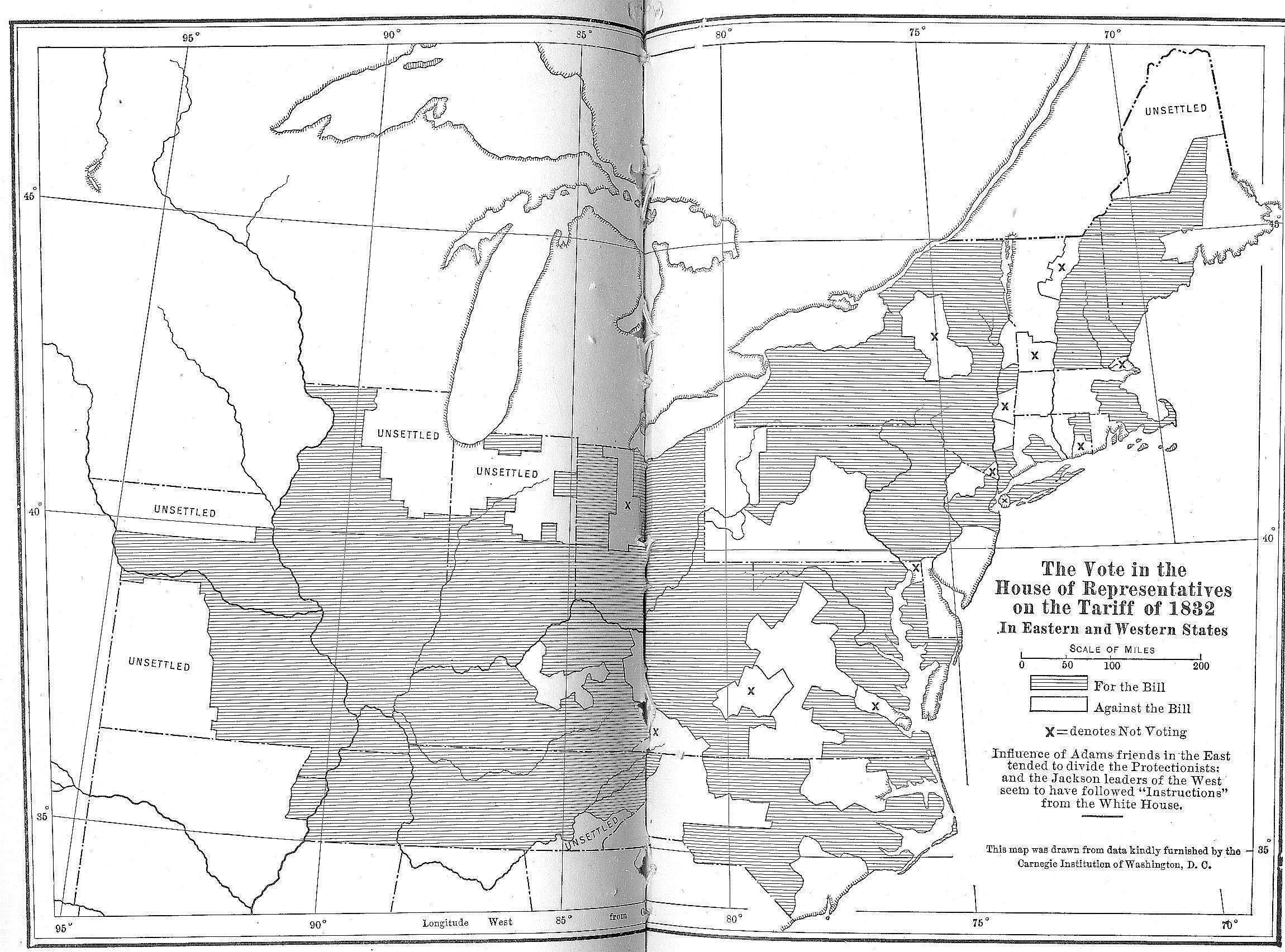 The attitude of South Carolina was that of every other Southern State from Virginia to Mississippi, and everywhere it was the older and more important groups of counties which so bitterly opposed the protective policy. In Virginia college boys met in formal session and resolved to wear “homespun” rather than submit to the “yoke” of the Northern manufacturers; in North Carolina the legislature declared the tariff law unconstitutional. At the commencement of the University of Georgia the orator of the occasion appeared in a suit of white cotton cloth, while his valet wore the cast-off suit of shining broadcloth. The “Tariff of Abominations,” passed in 1828, was producing revolutionary results in all the region where tobacco, cotton, and rice were grown, and this was the governing section of the South.[1]