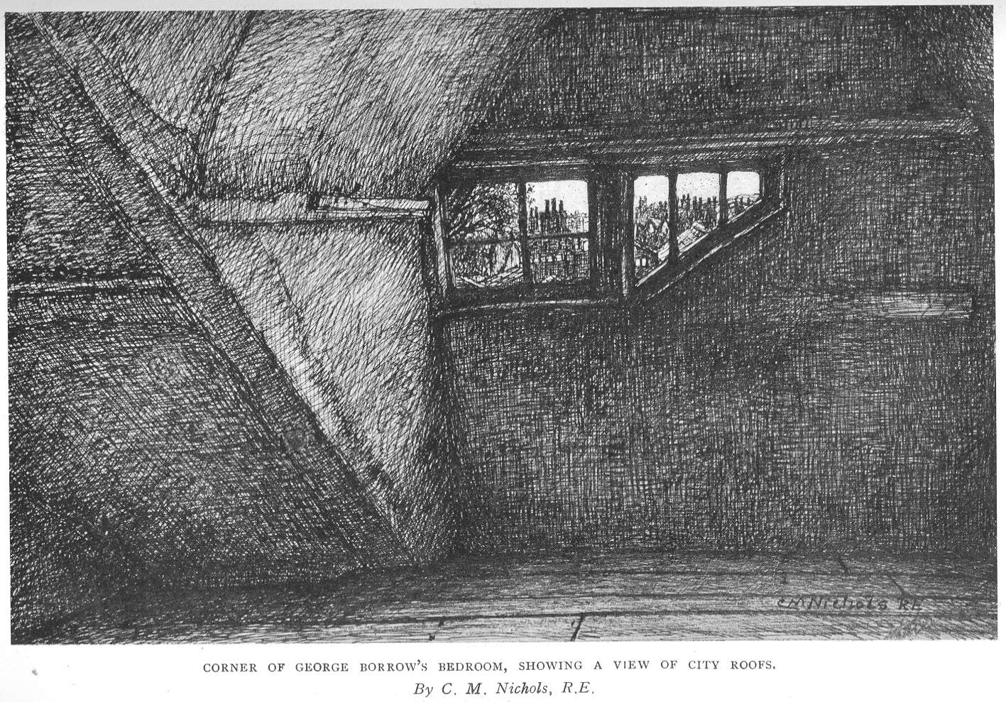 The Committee are indebted to numerous Borrovians for the loan of Illustrations and Contributions of literary items to the text, to Miss C. M. Nichols, R.E., for her charming Pen Pictures of nooks and corners of Borrow’s old home in Willow Lane, the Rev. F. W. Orde Ward for his appreciative stanzas, and Mr. E. Peake for his Ode to the Flower, whilst special mention must be made of Mr. A. J. Munnings’ inspiring design of George Borrow and Petulengro overlooking the City of Norwich for the cover.