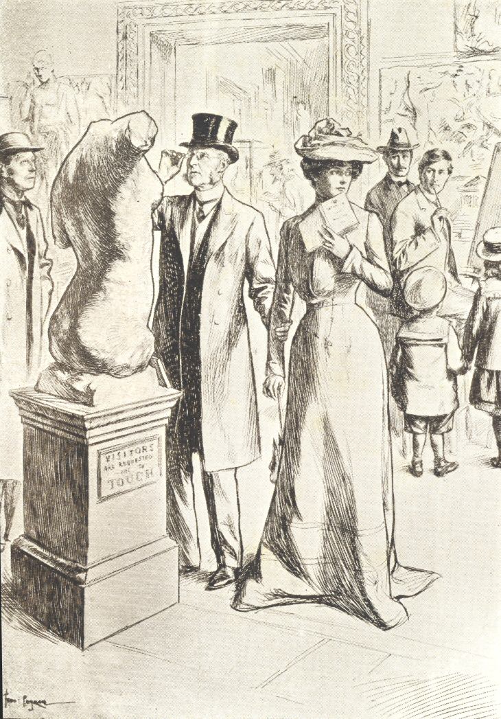 “He hung about her while she was dressing in the morning. Just as she had got her hair fixed he would kiss it passionately and it would come down again. All meal-time he would hold her hand under the table and insist on feeding her with a fork. Before marriage he had behaved once or twice in this sort of way at picnics; and after marriage, when at breakfast-time he had sat at the other end of the table reading the paper or his letters, she had reminded him of it reproachfully. The entire day he never left her side. She could never read a book; instead, he would read to her aloud, generally Browning’ poems or translations from Goethe. Reading aloud was not an accomplishment of his, but in their courting days she had expressed herself pleased at his attempts, and of this he took care, in his turn, to remind her. It was his idea that if the game were played at all, she should take a hand also. If he was to blither, it was only fair that she should bleat back. As he explained, for the future they would both be lovers all their life long; and no logical argument in reply could she think of. If she tried to write a letter, he would snatch away the paper her dear hands were pressing and fall to kissing it—and, of course, smearing it. When he wasn’t giving her pins and needles by sitting on her feet he was balancing himself on the arm of her chair and occasionally falling over on top of her. If she went shopping, he went with her and made himself ridiculous at the dressmaker’s. In society he took no notice of anybody but of her, and was hurt if she spoke to anybody but to him. Not that it was often, during that month, that they did see any society; most invitations he refused for them both, reminding her how once upon a time she had regarded an evening alone with him as an entertainment superior to all others. He called her ridiculous names, talked to her in baby language; while a dozen times a day it became necessary for her to take down her back hair and do it up afresh. At the end of a month, as I have said, it was she who suggested a slight cessation of affection.”